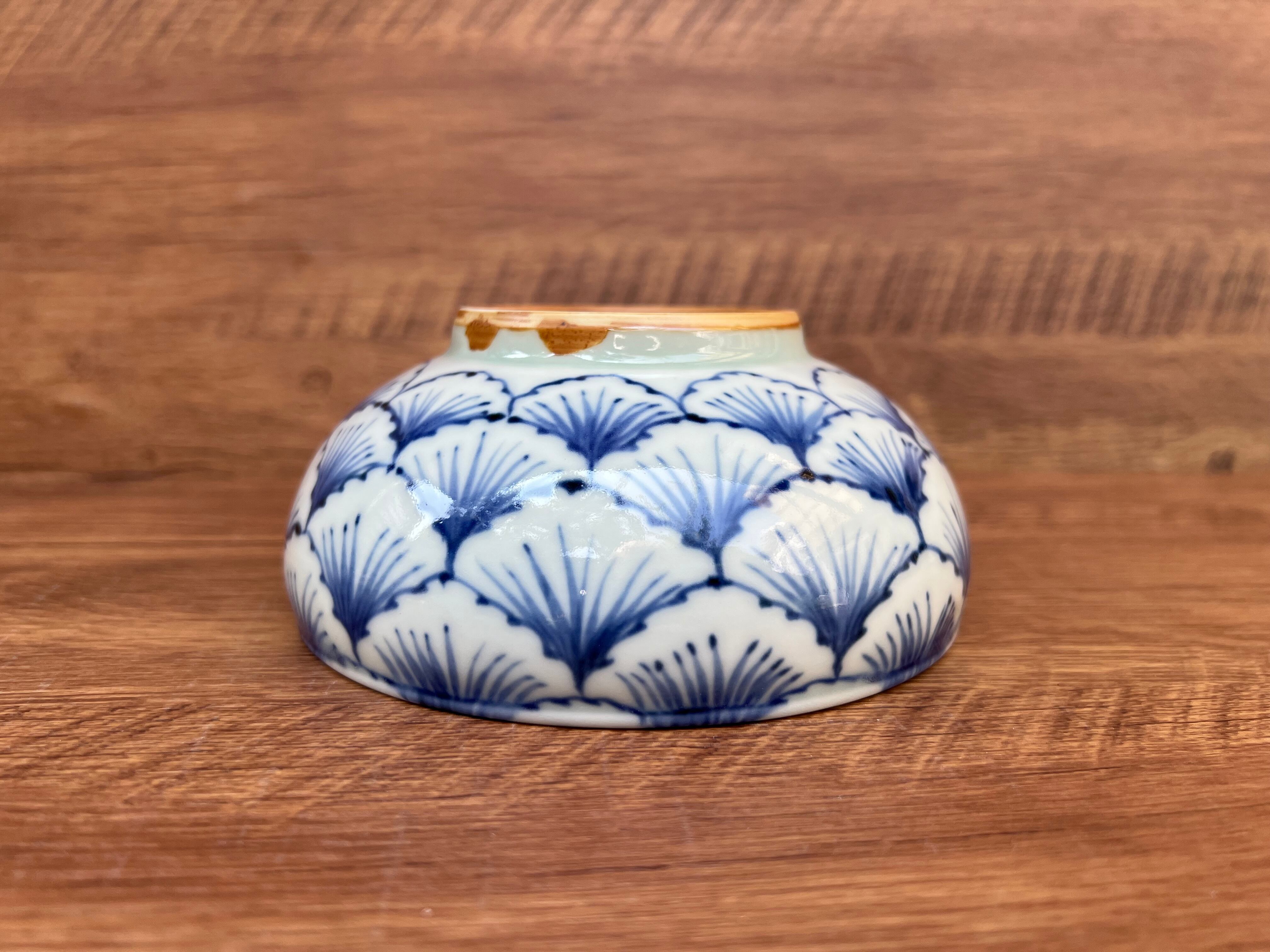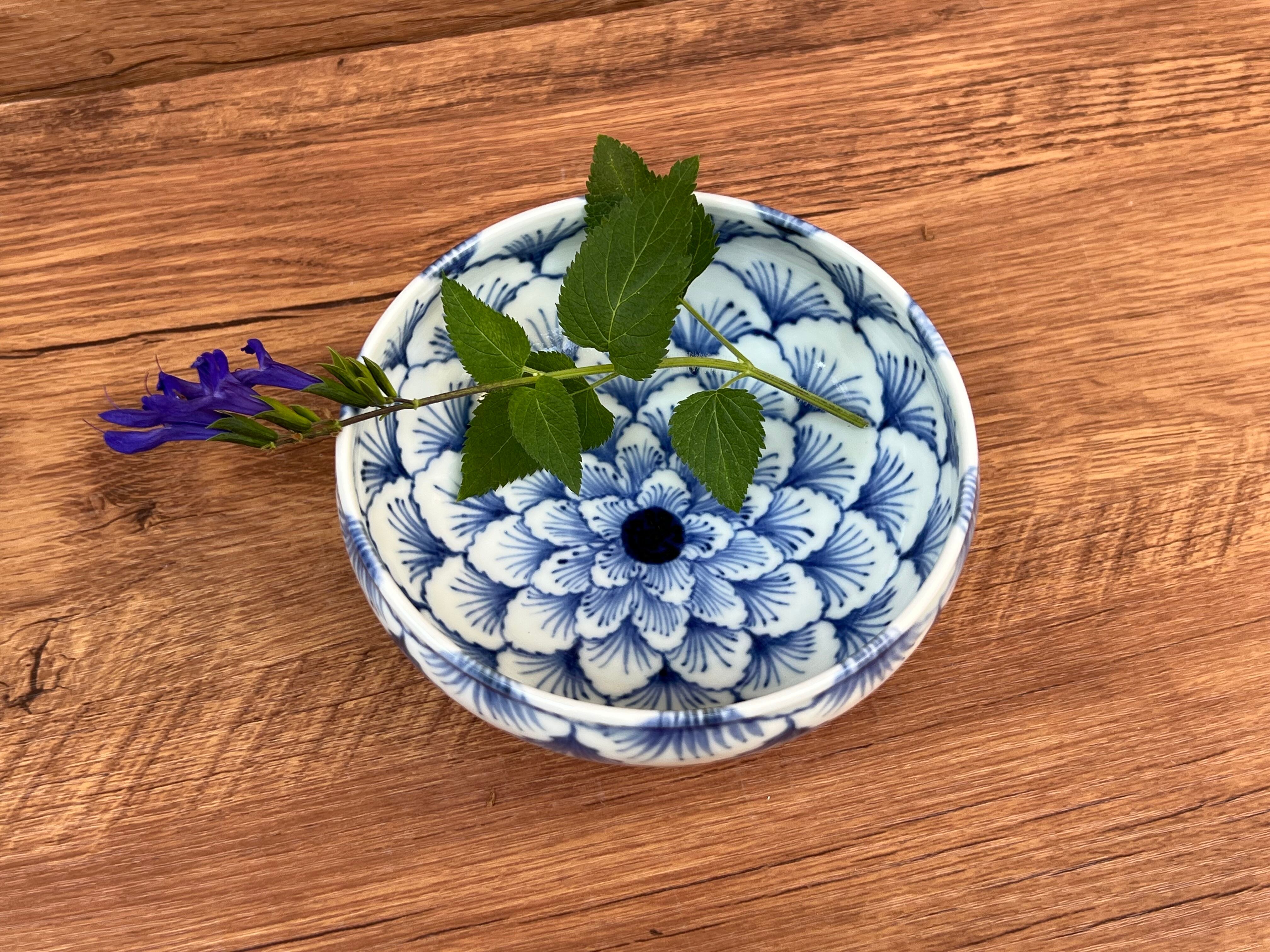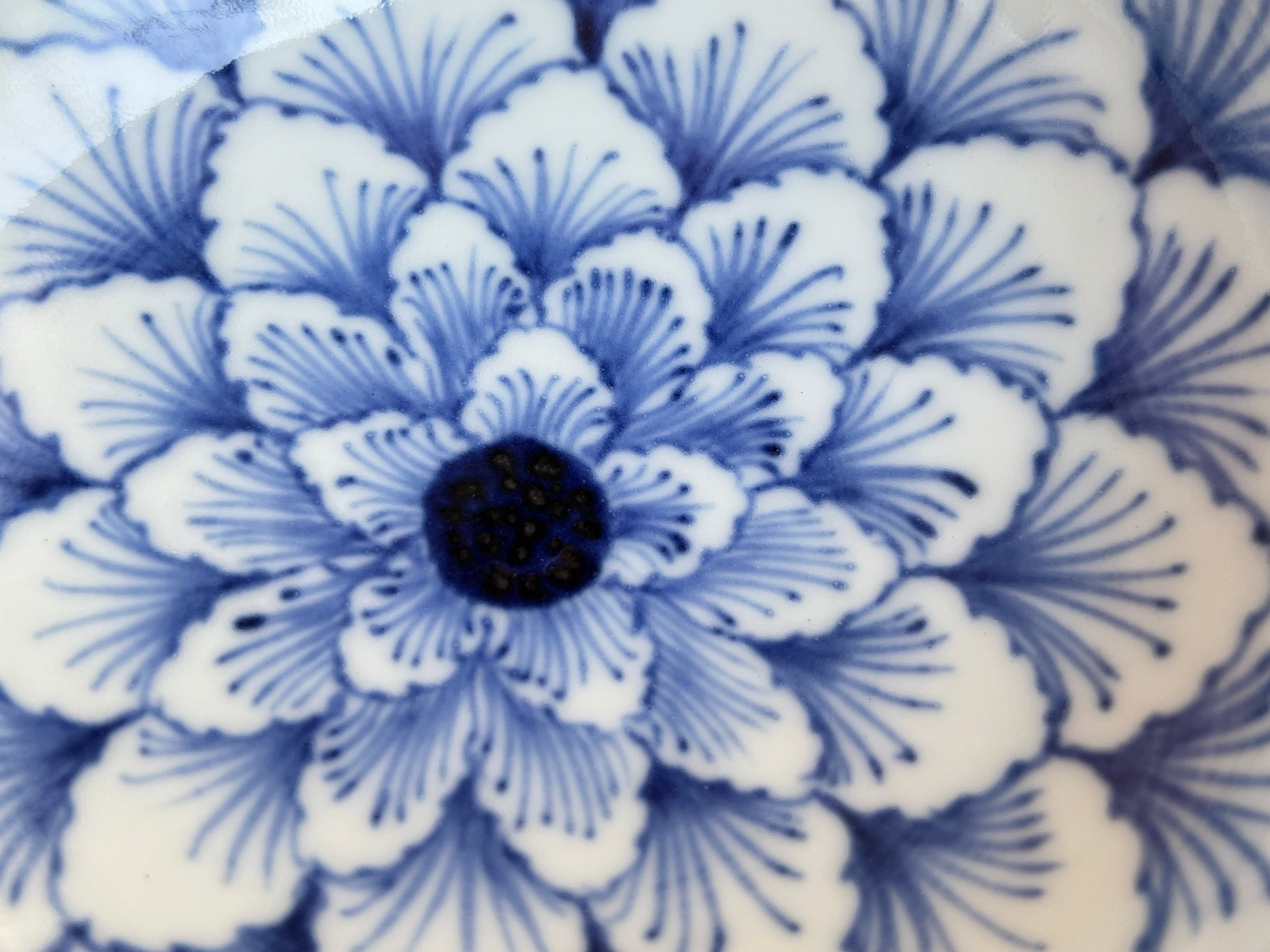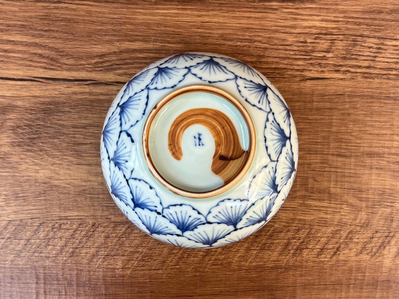 コロンとまあるい形の鉢。手のひらに乗せると、何だかほっこりしてきます。中から表に向かい花弁が描かれていて、最後何処を持って描いているのでしょうか?