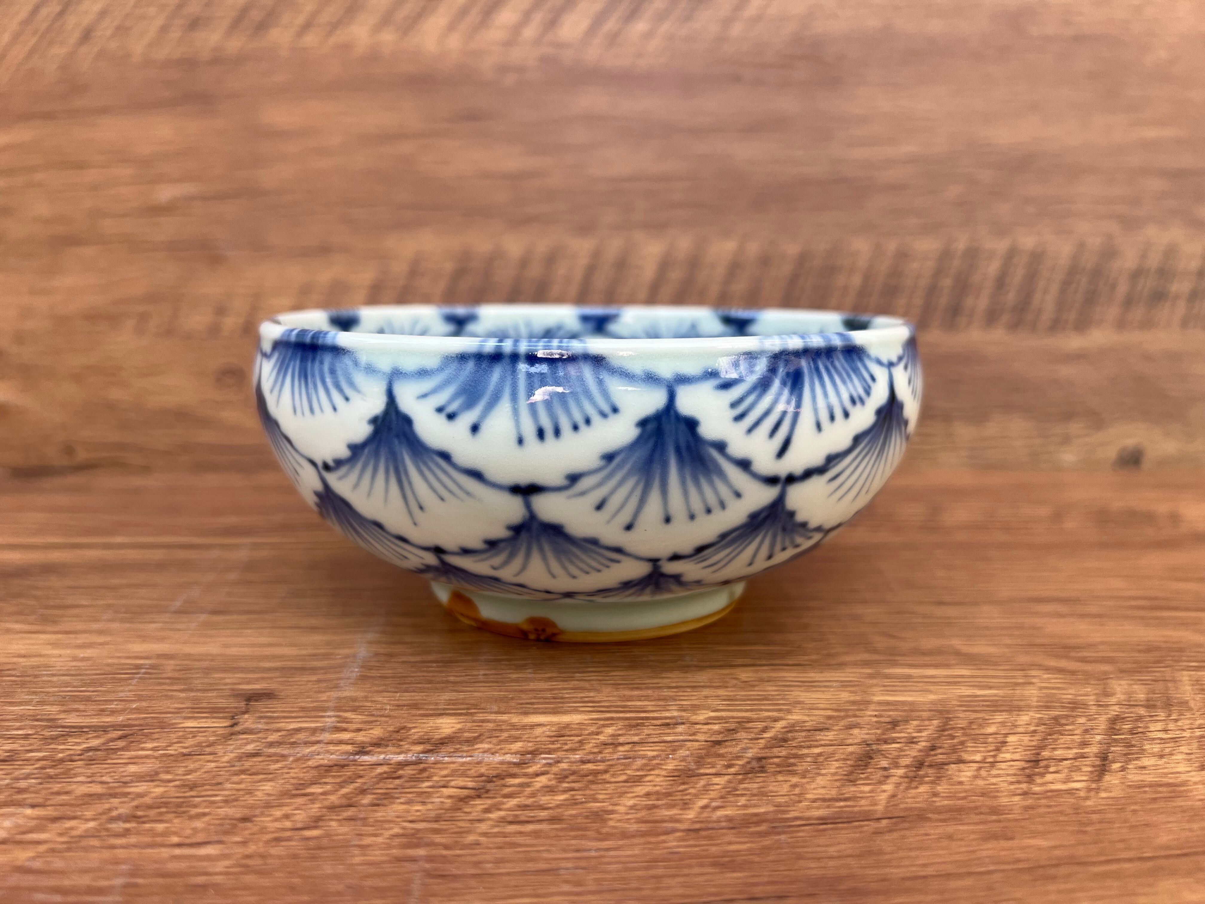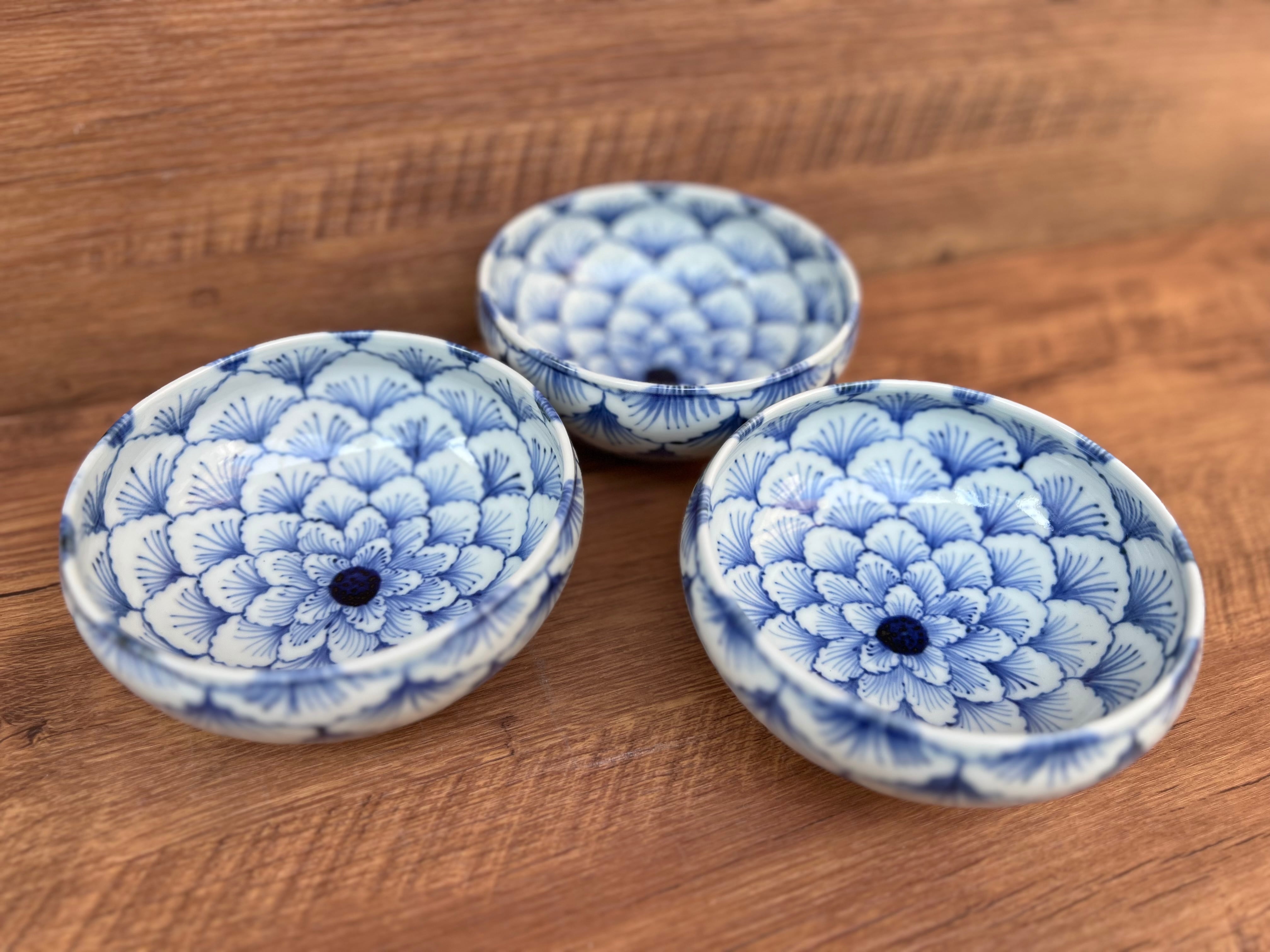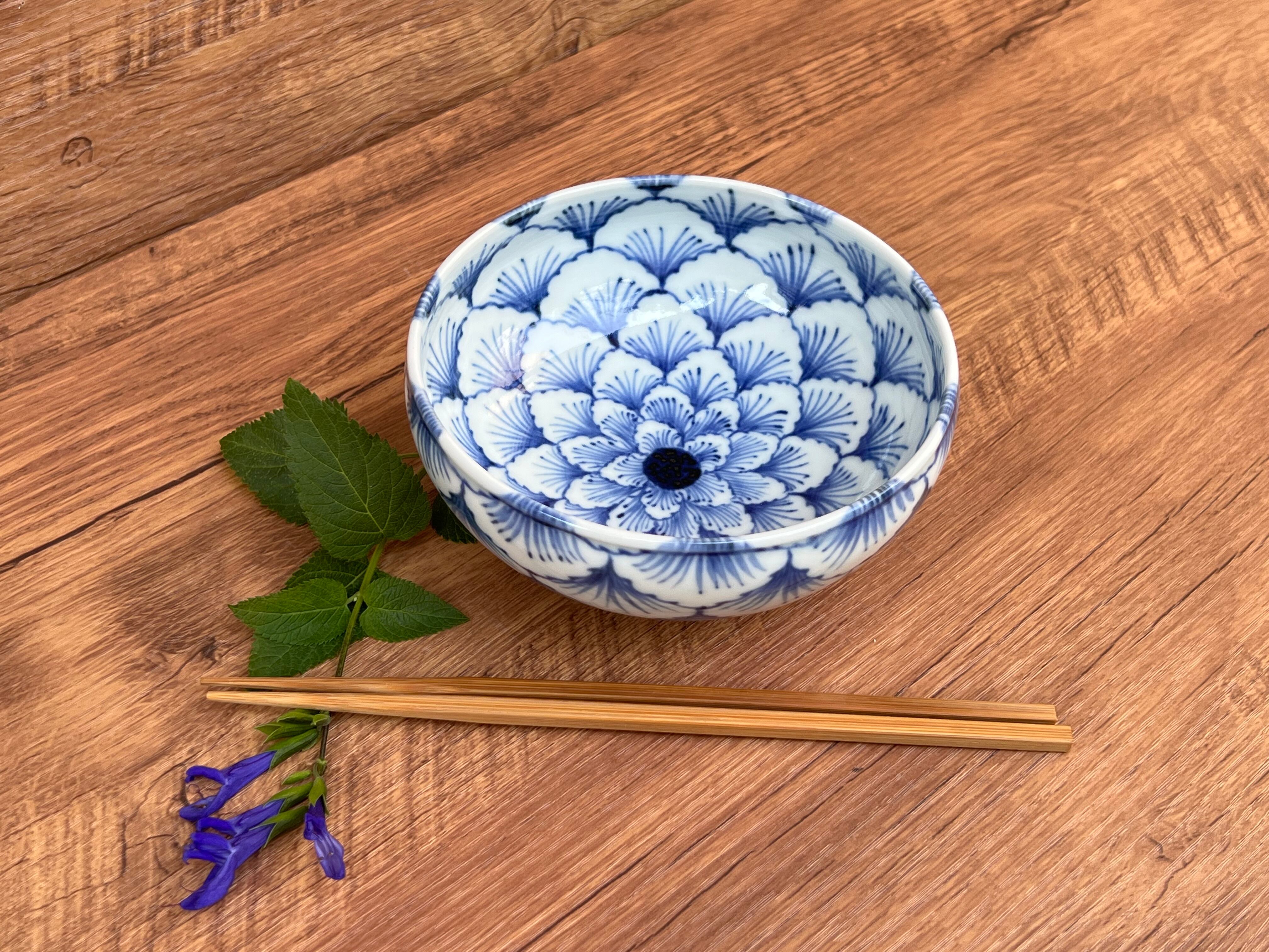 コロンとまあるい形の鉢。手のひらに乗せると、何だかほっこりしてきます。中から表に向かい花弁が描かれていて、最後何処を持って描いているのでしょうか?