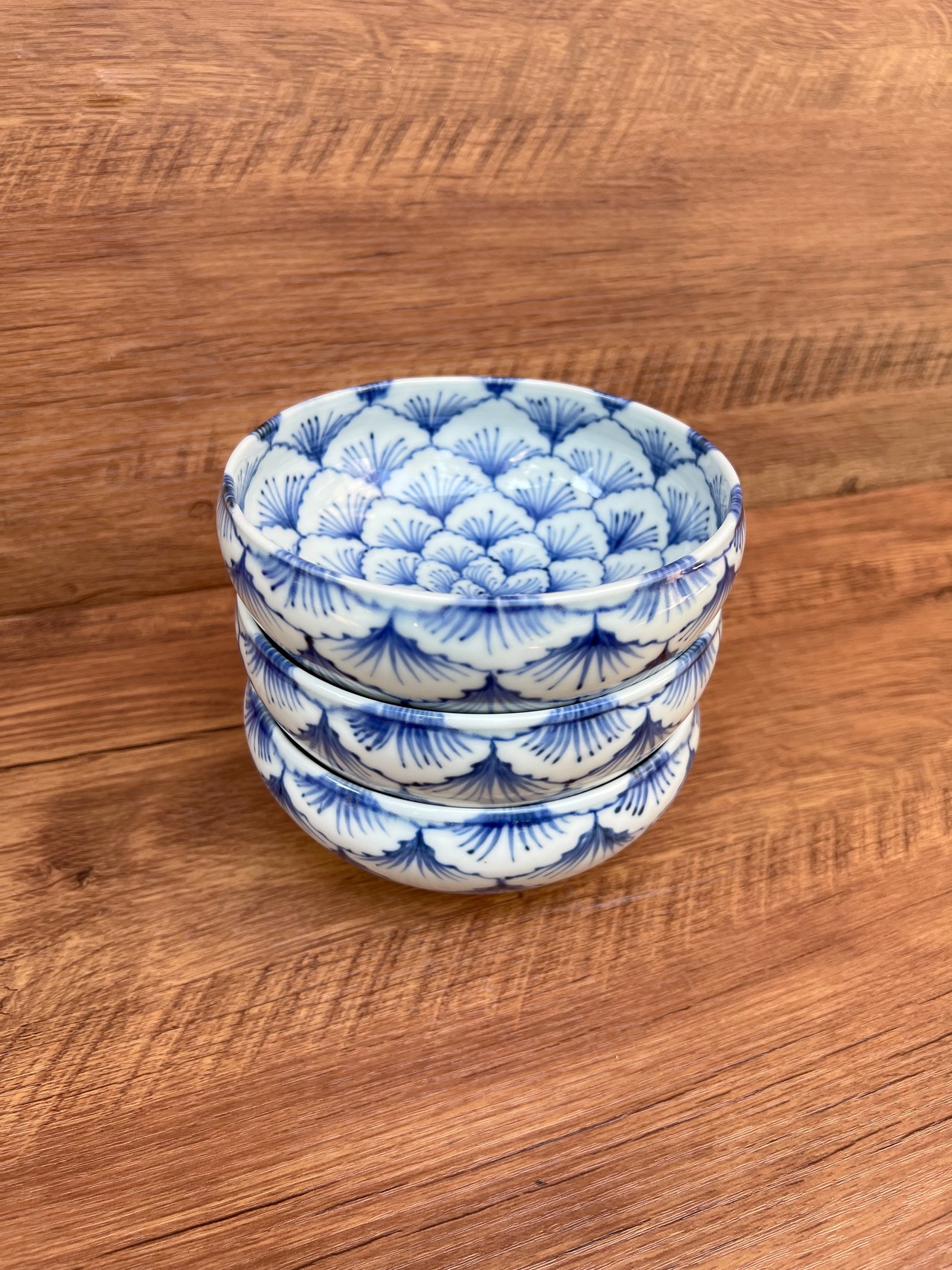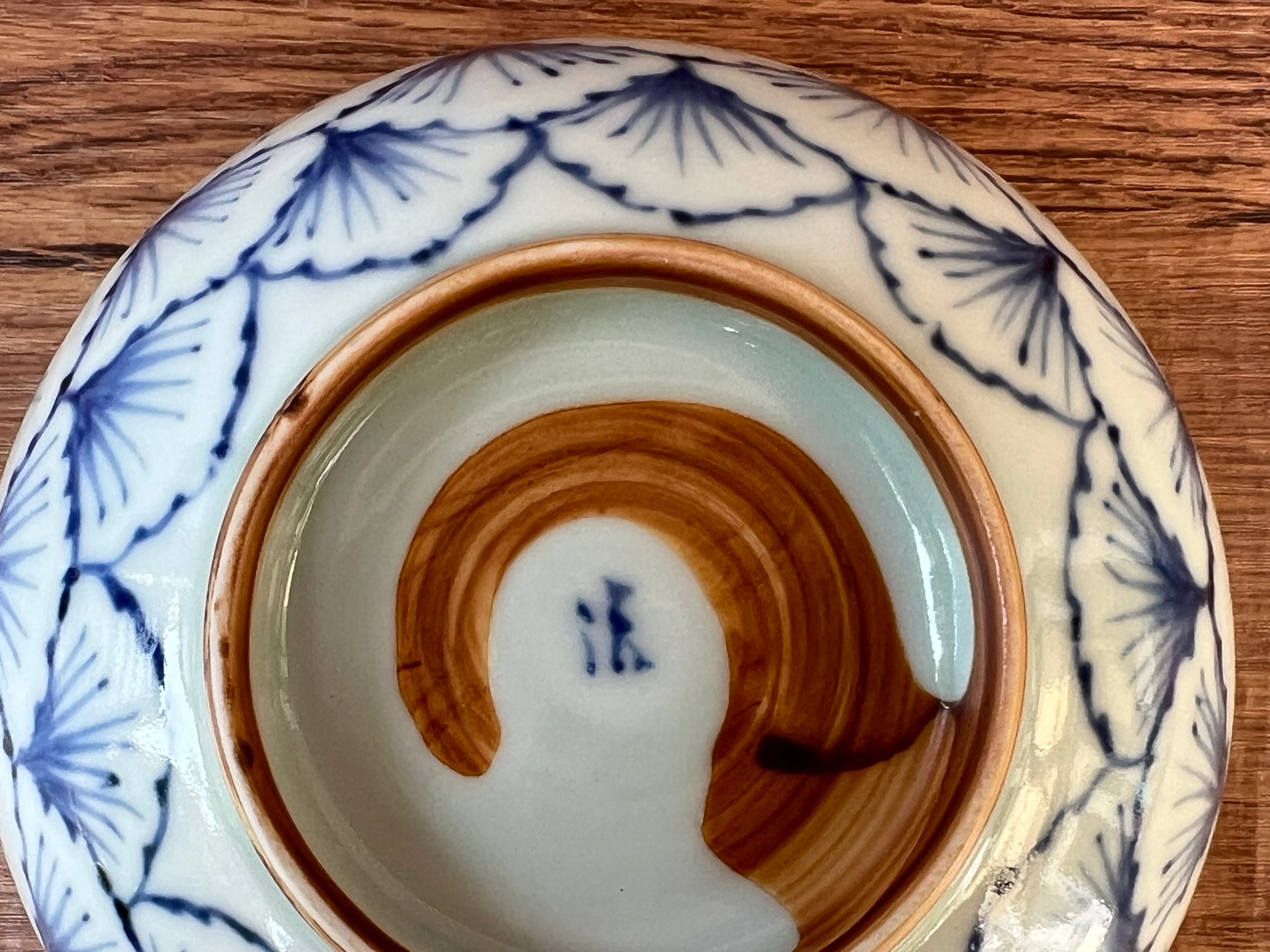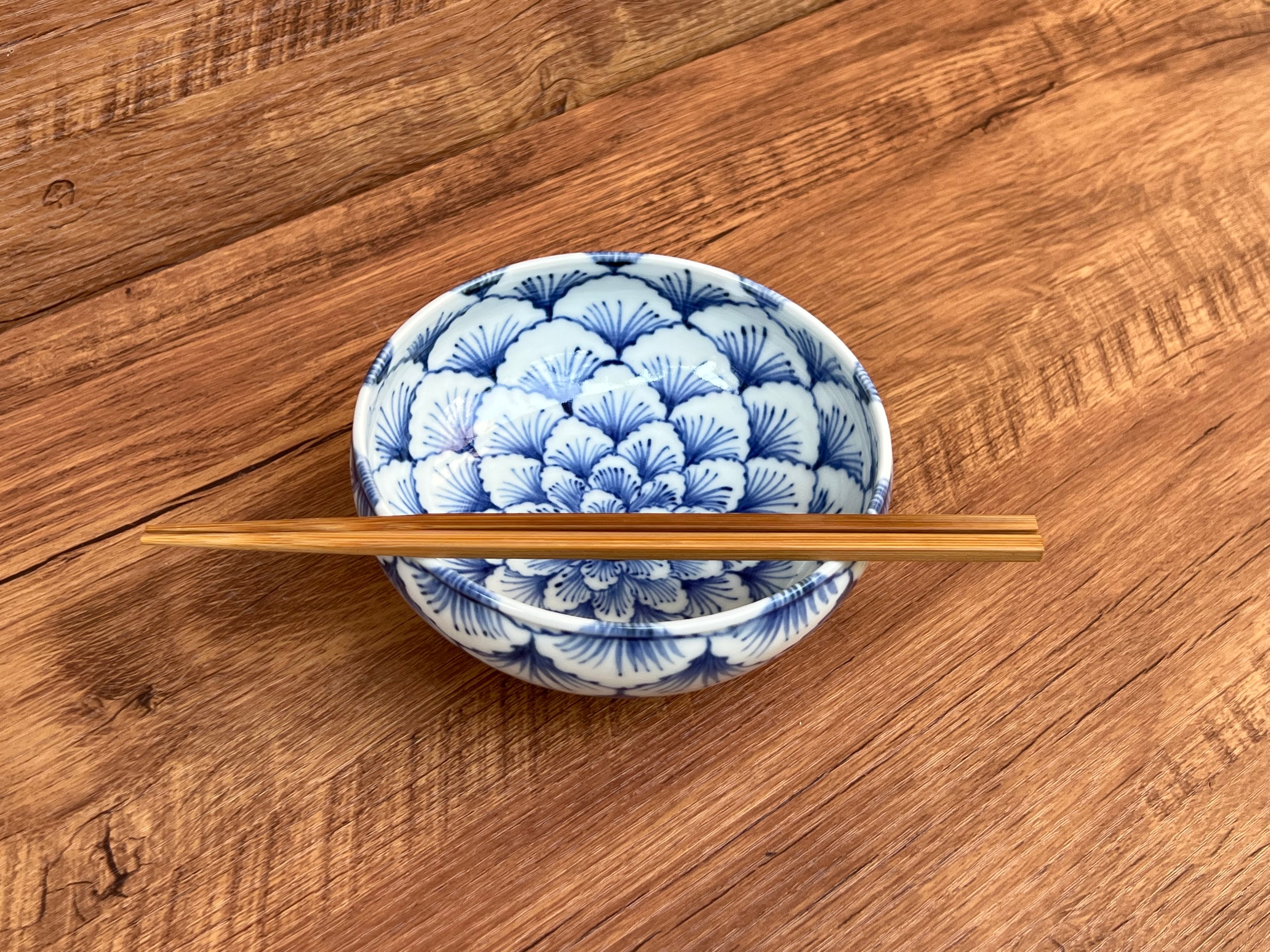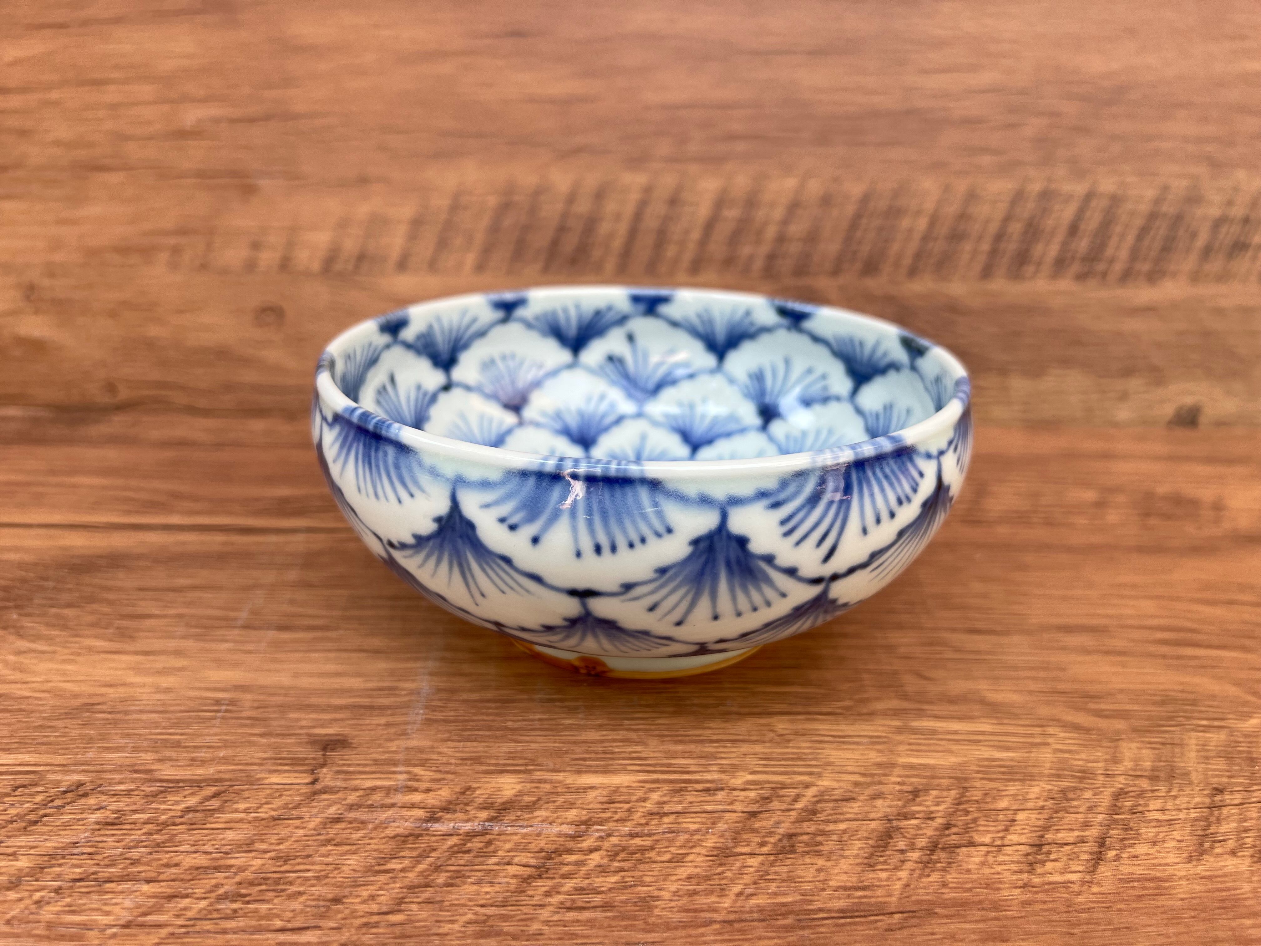 コロンとまあるい形の鉢。手のひらに乗せると、何だかほっこりしてきます。中から表に向かい花弁が描かれていて、最後何処を持って描いているのでしょうか?