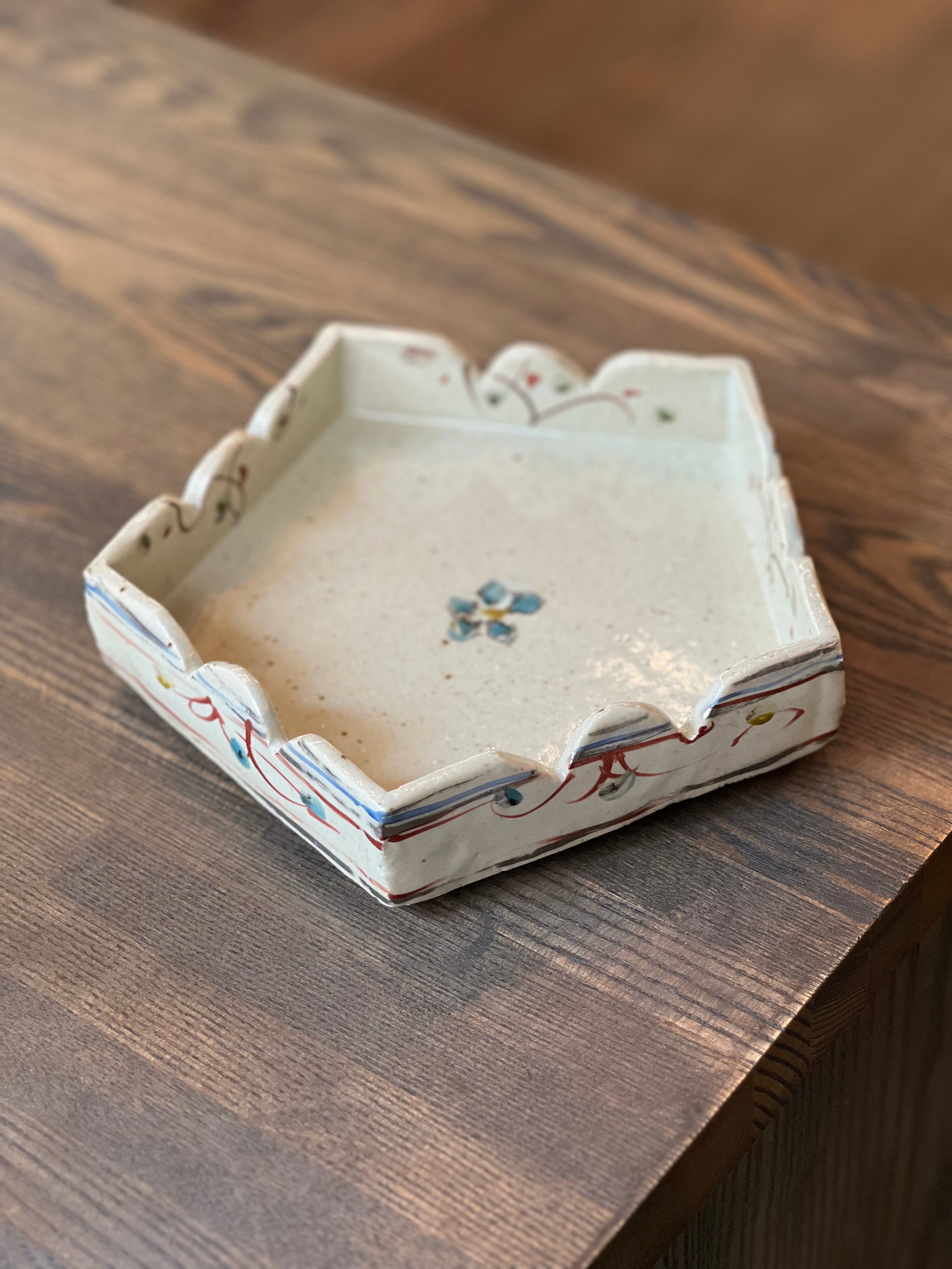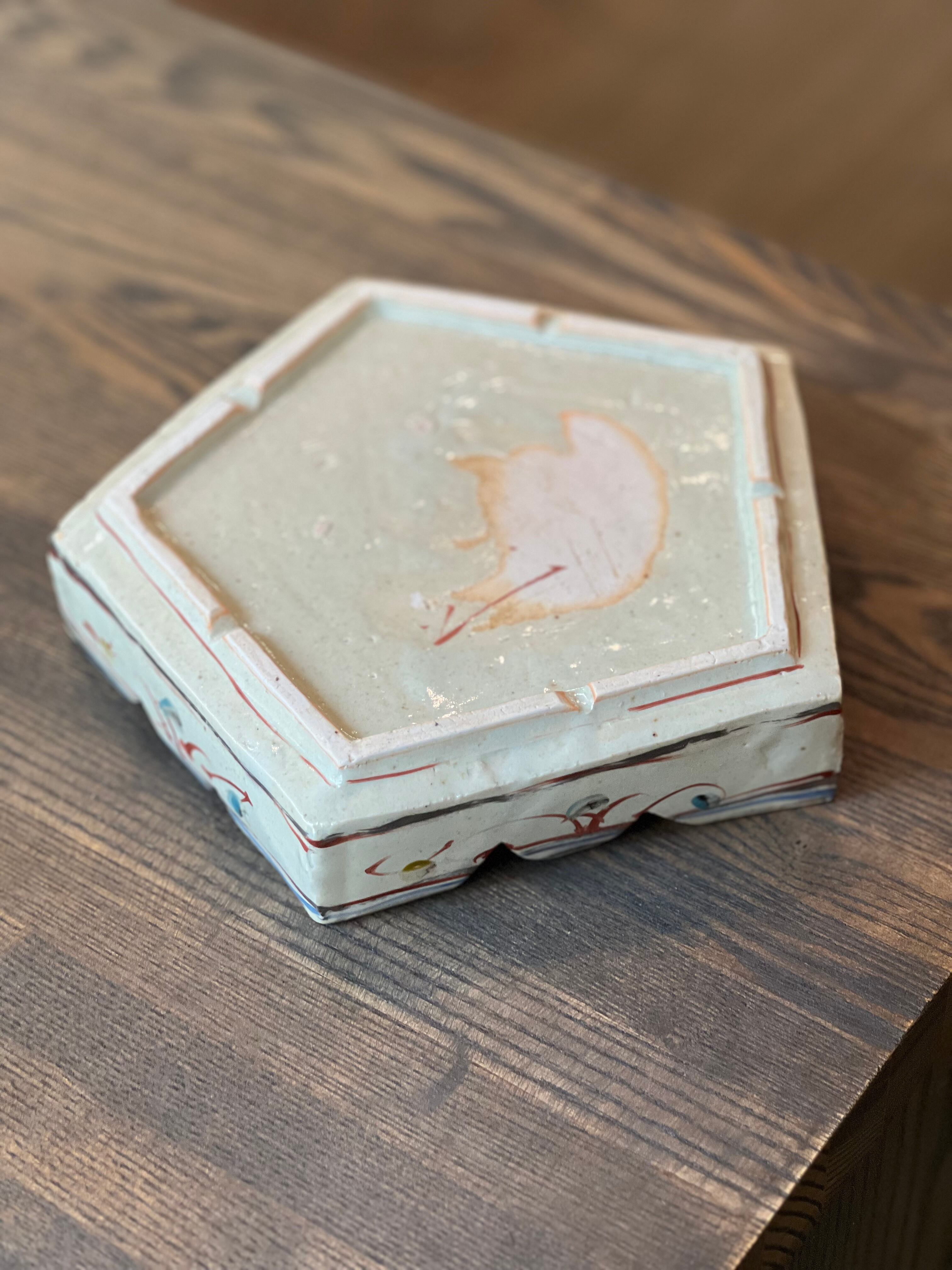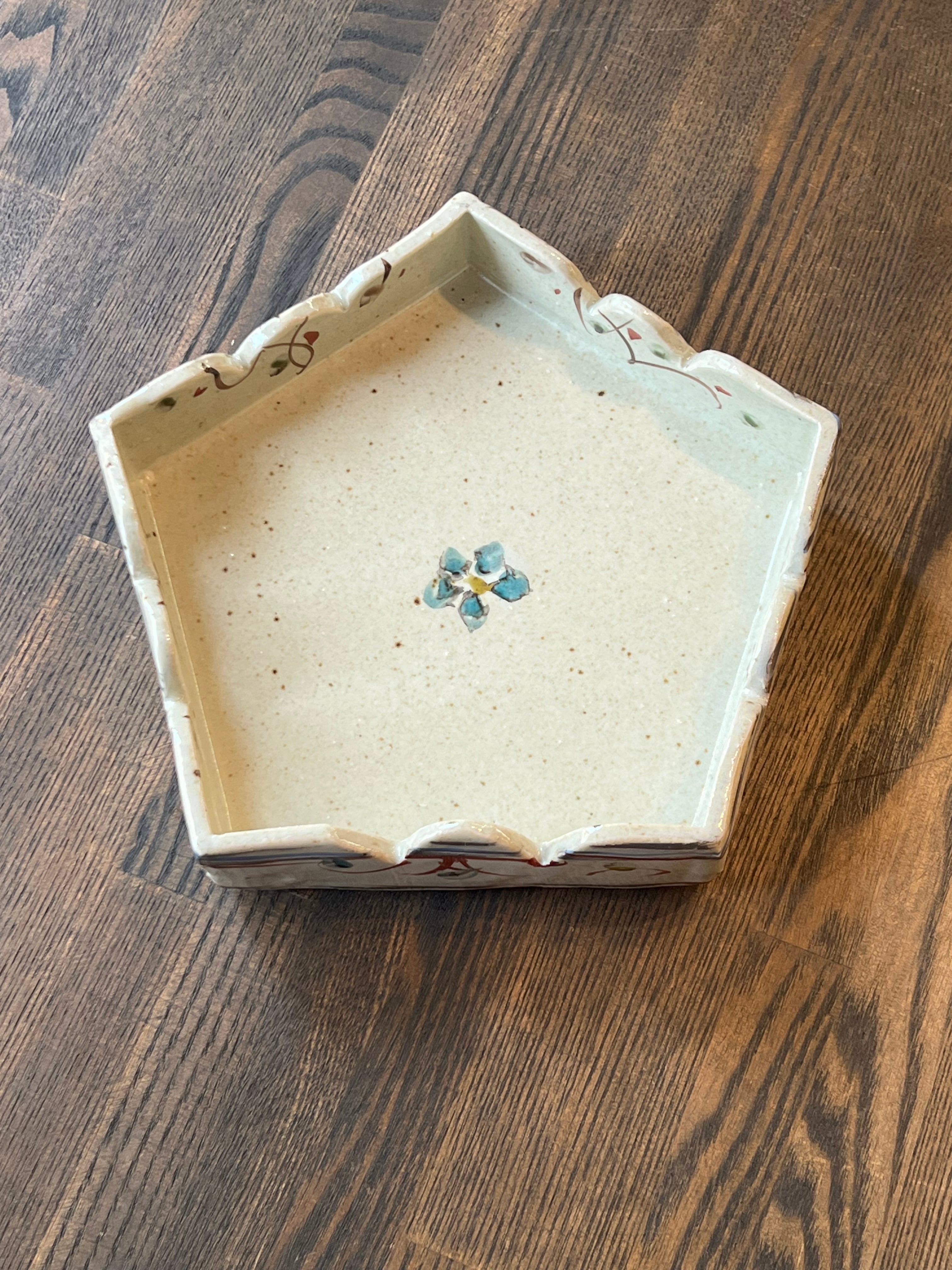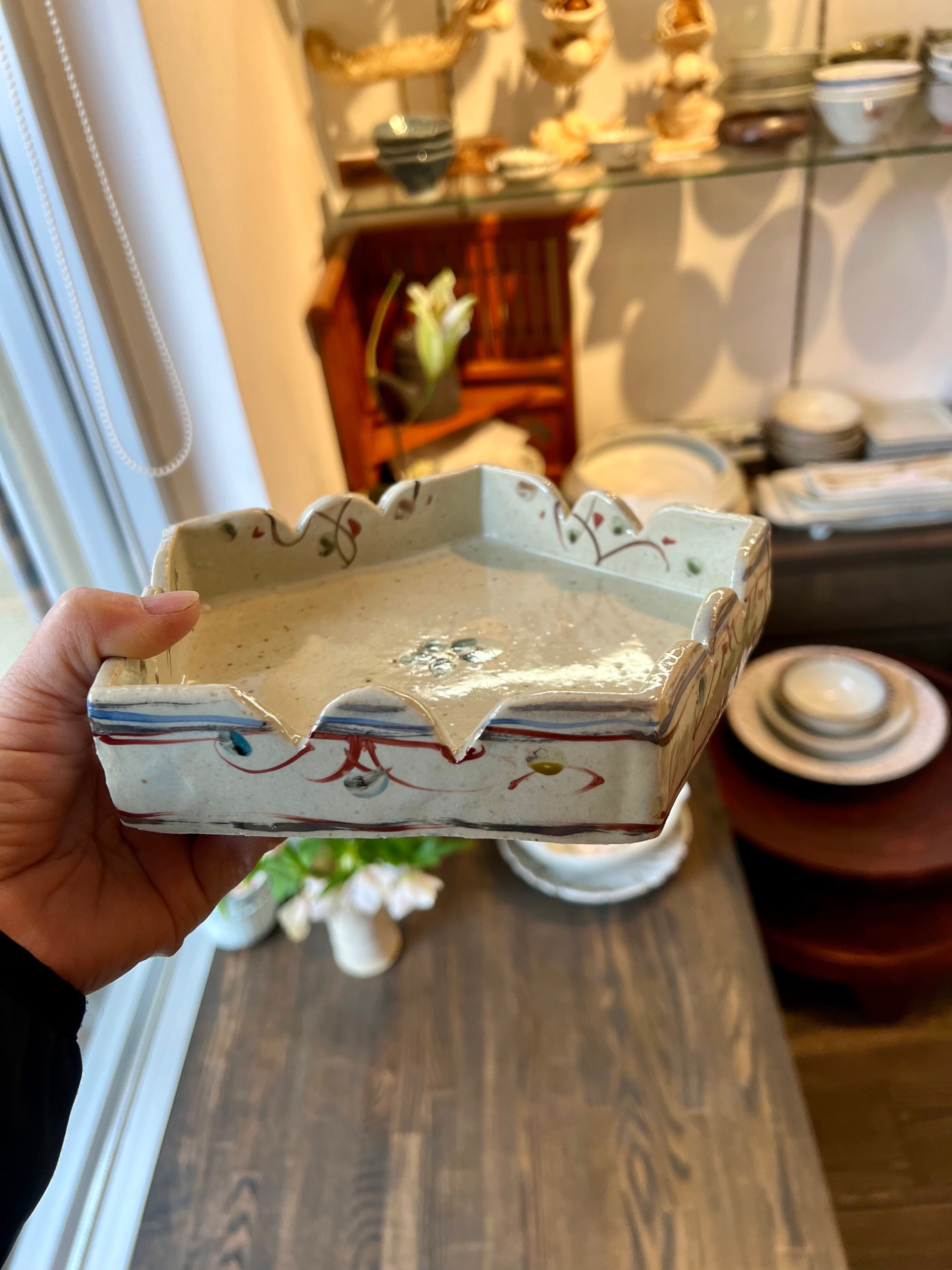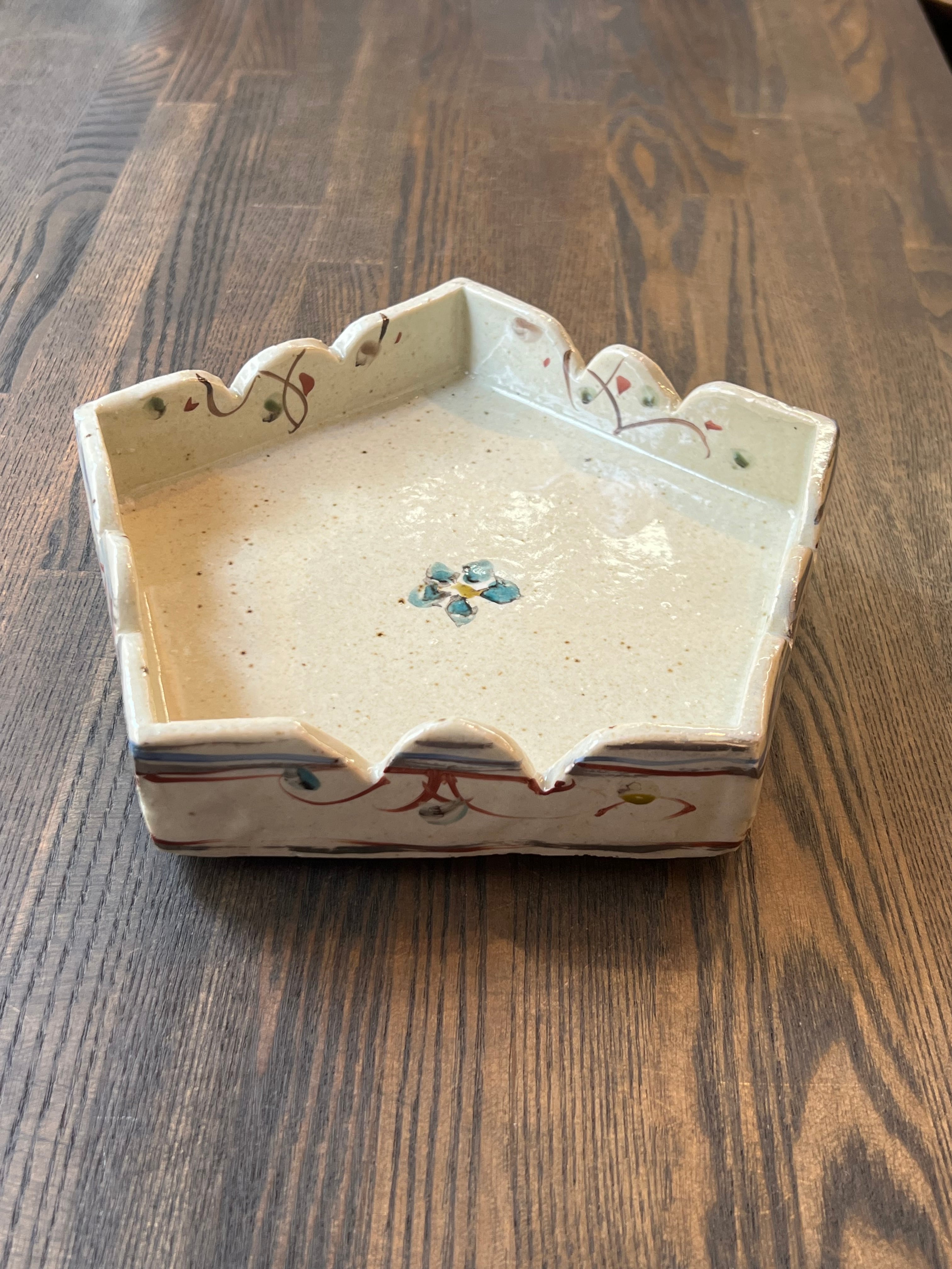 5角形の鉢です。特別なおもてなしの日に、美味しい和菓子をのせてお客様に振舞いたいですね。軽快な色絵が施された可愛いい鉢です。