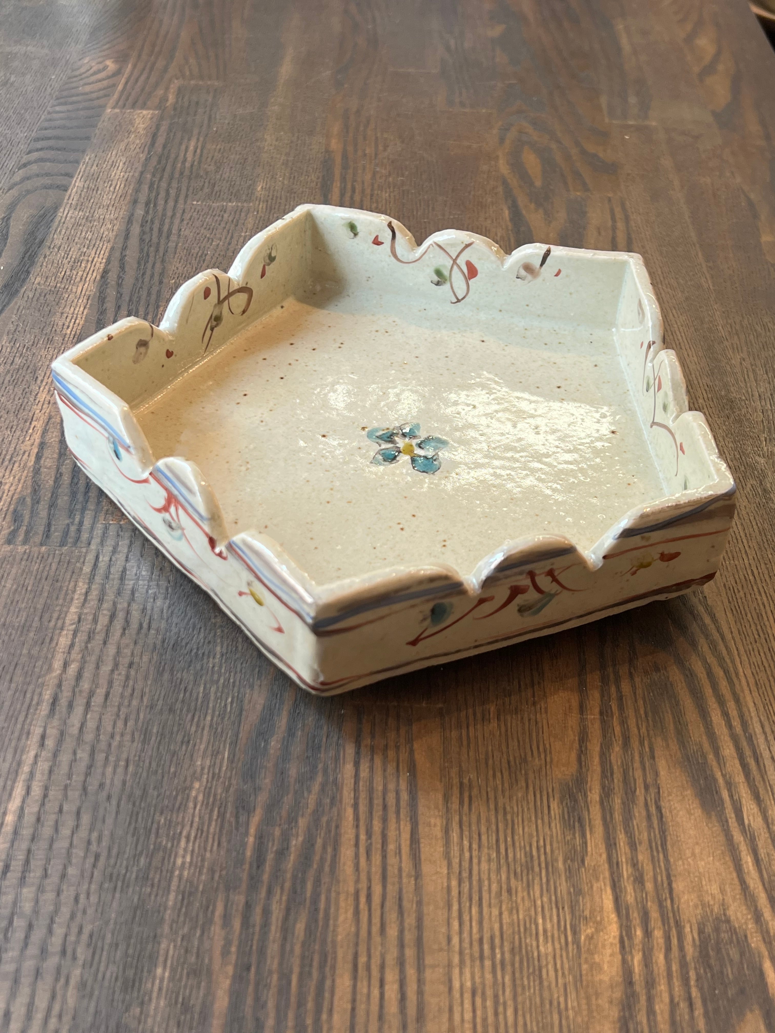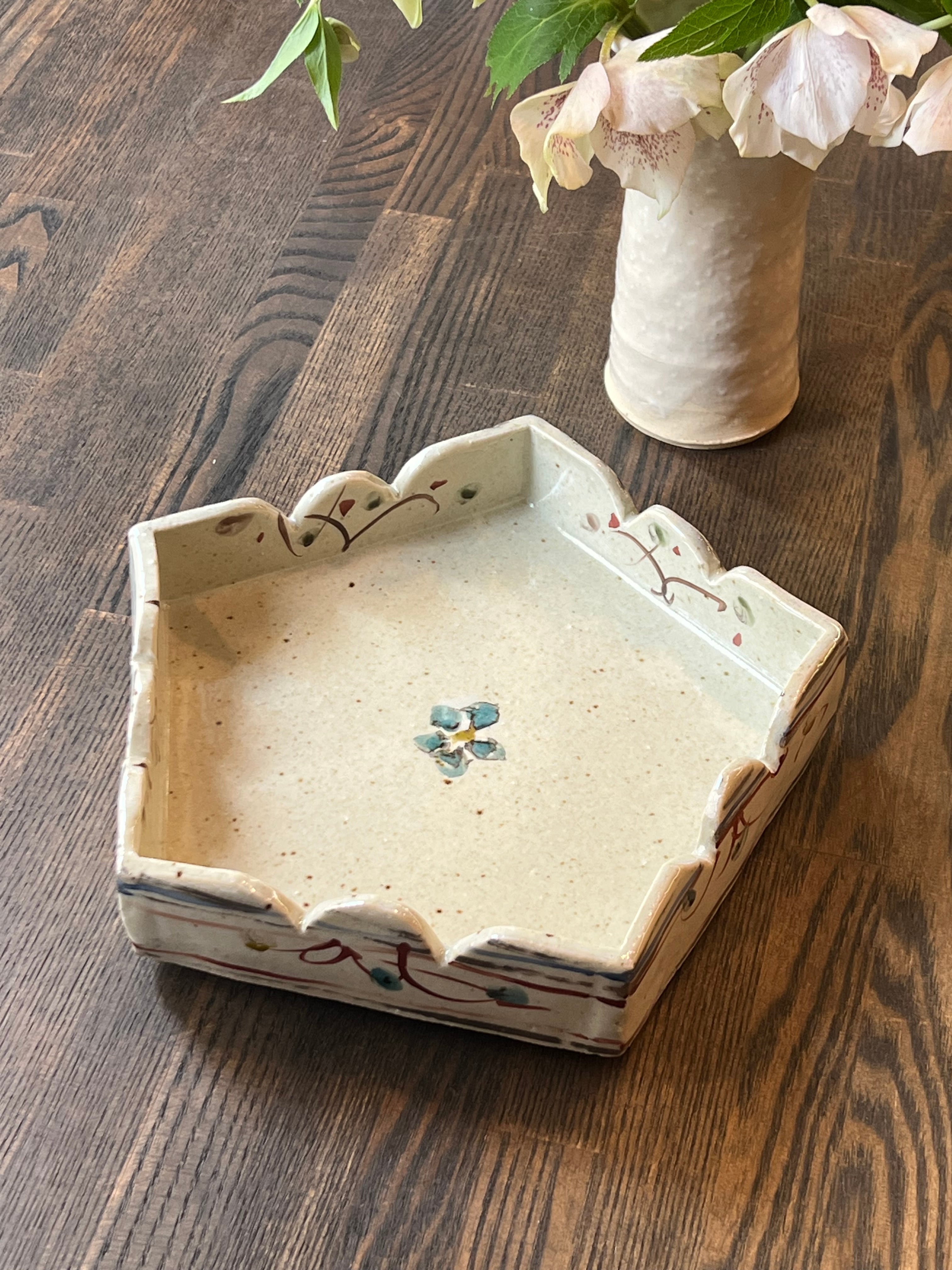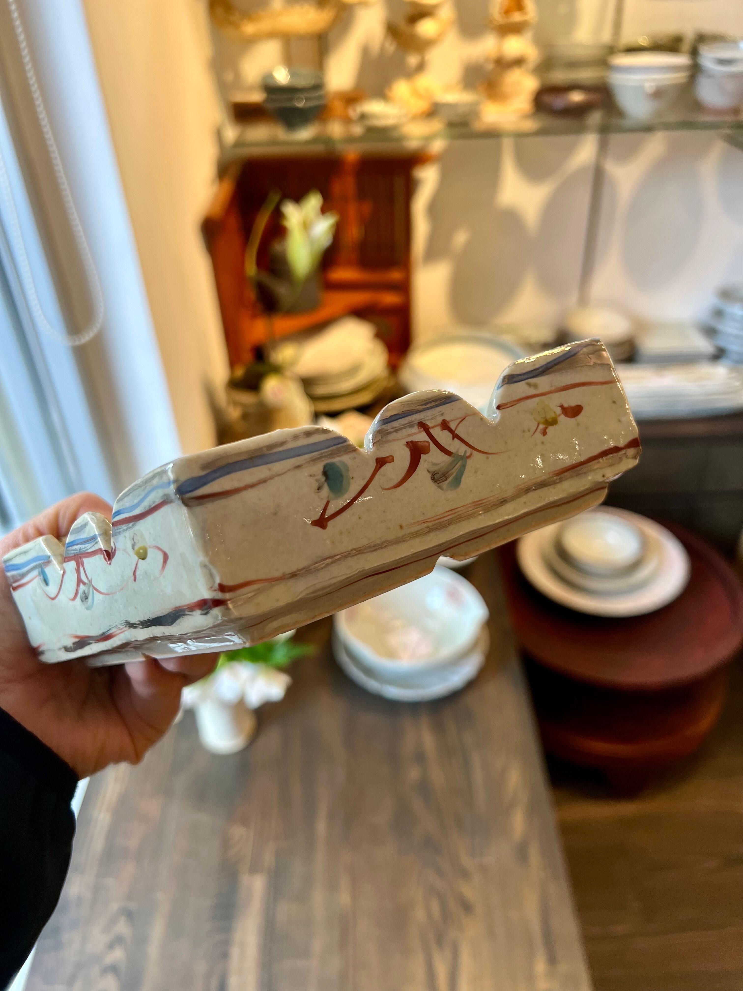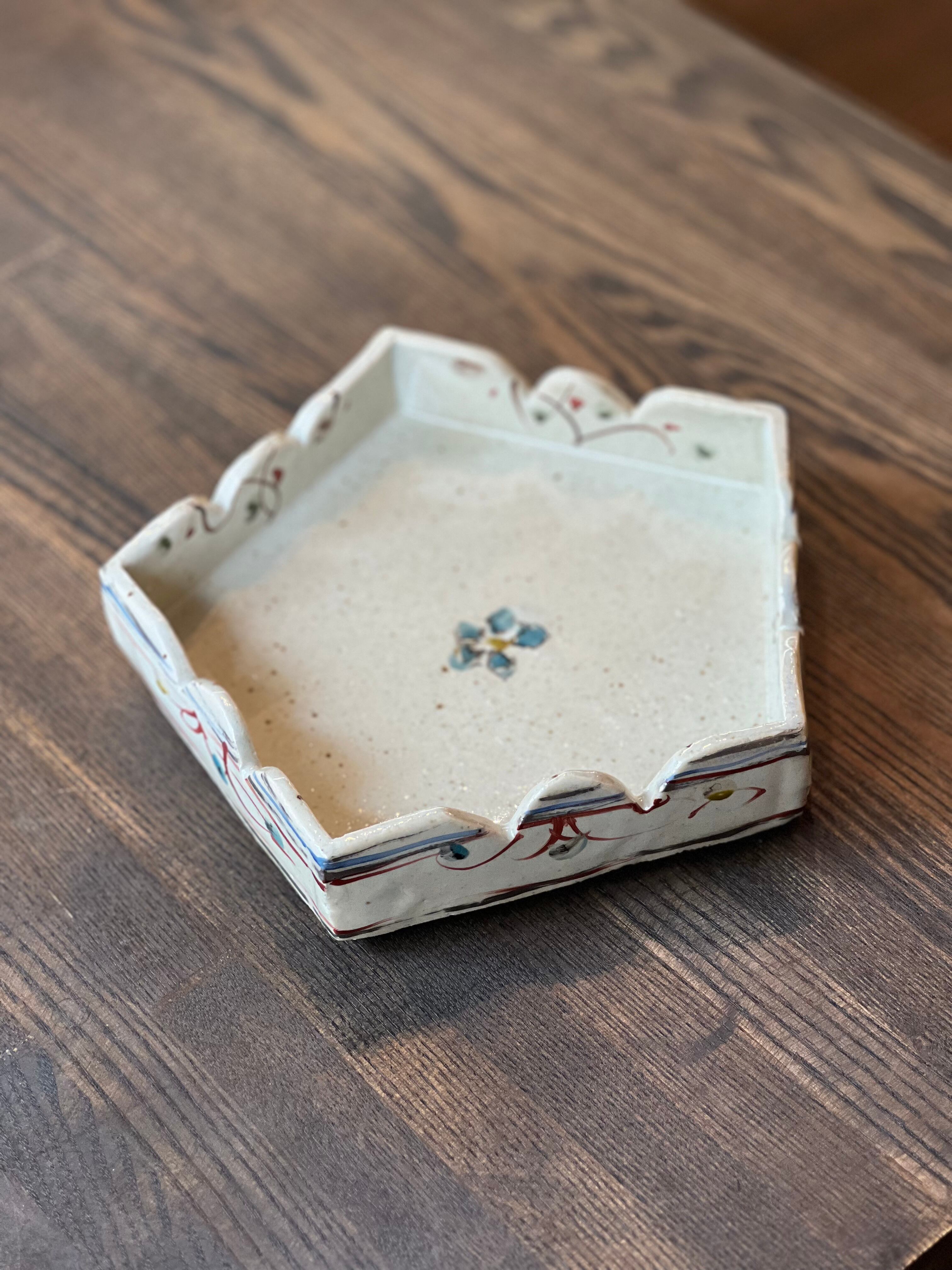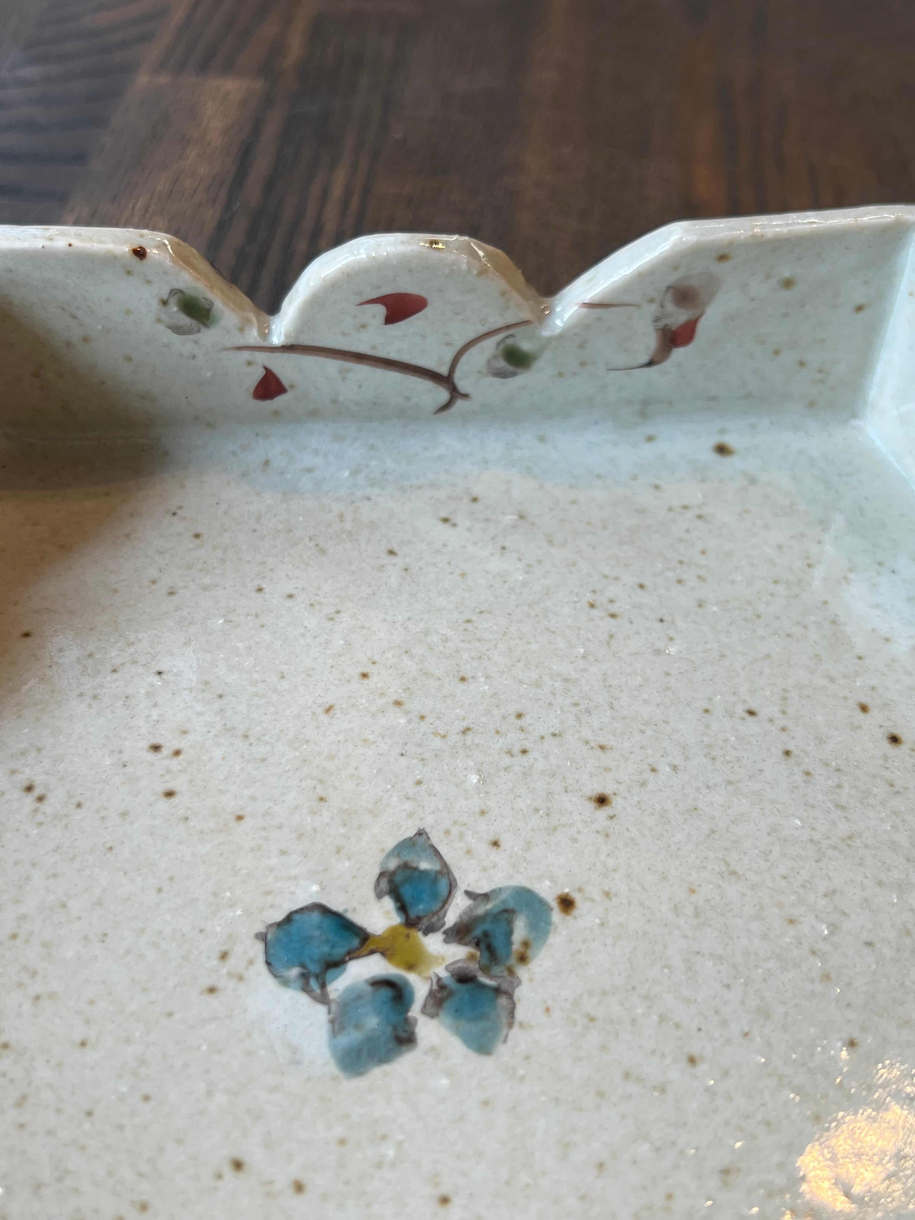 5角形の鉢です。特別なおもてなしの日に、美味しい和菓子をのせてお客様に振舞いたいですね。軽快な色絵が施された可愛いい鉢です。