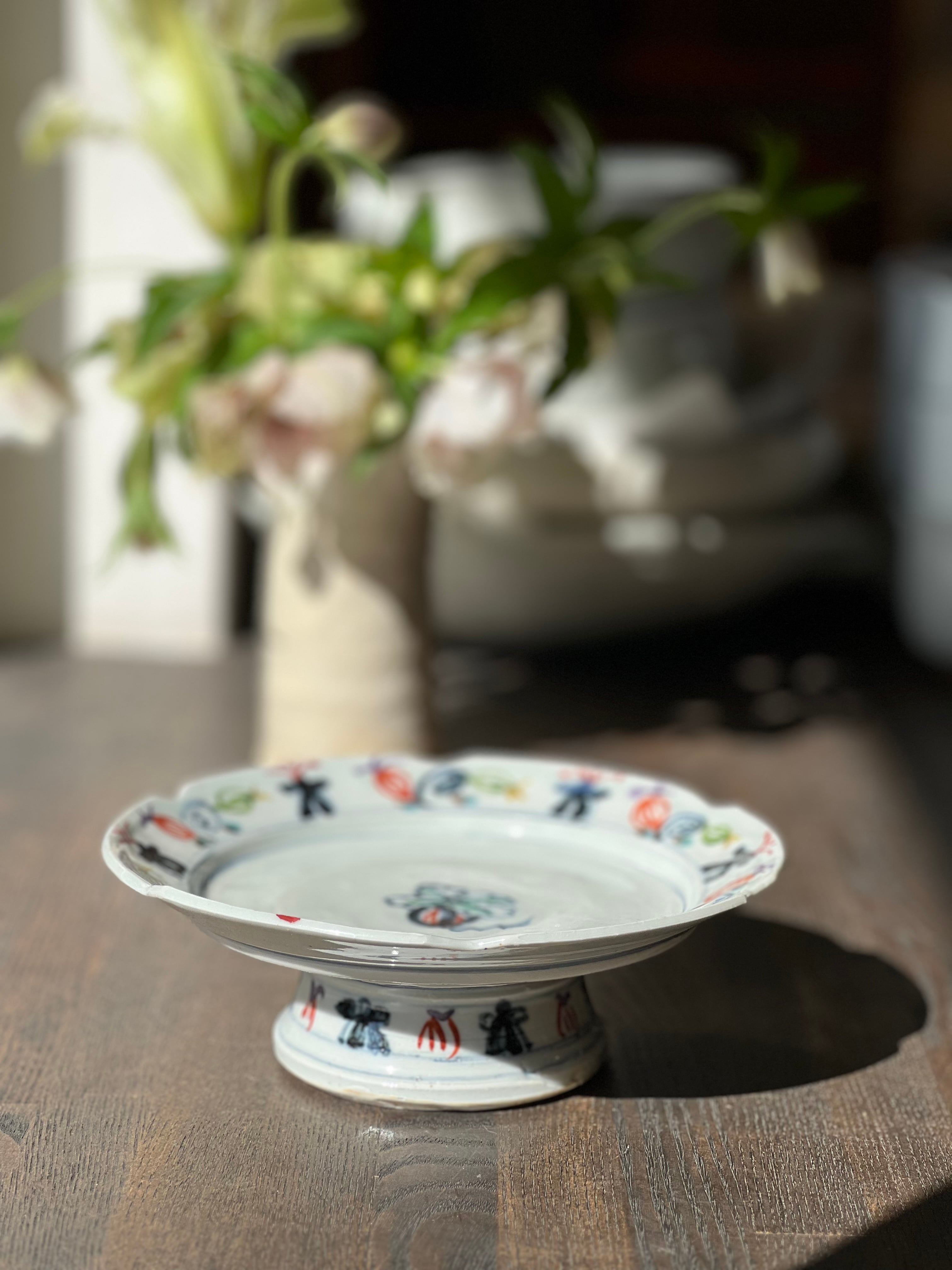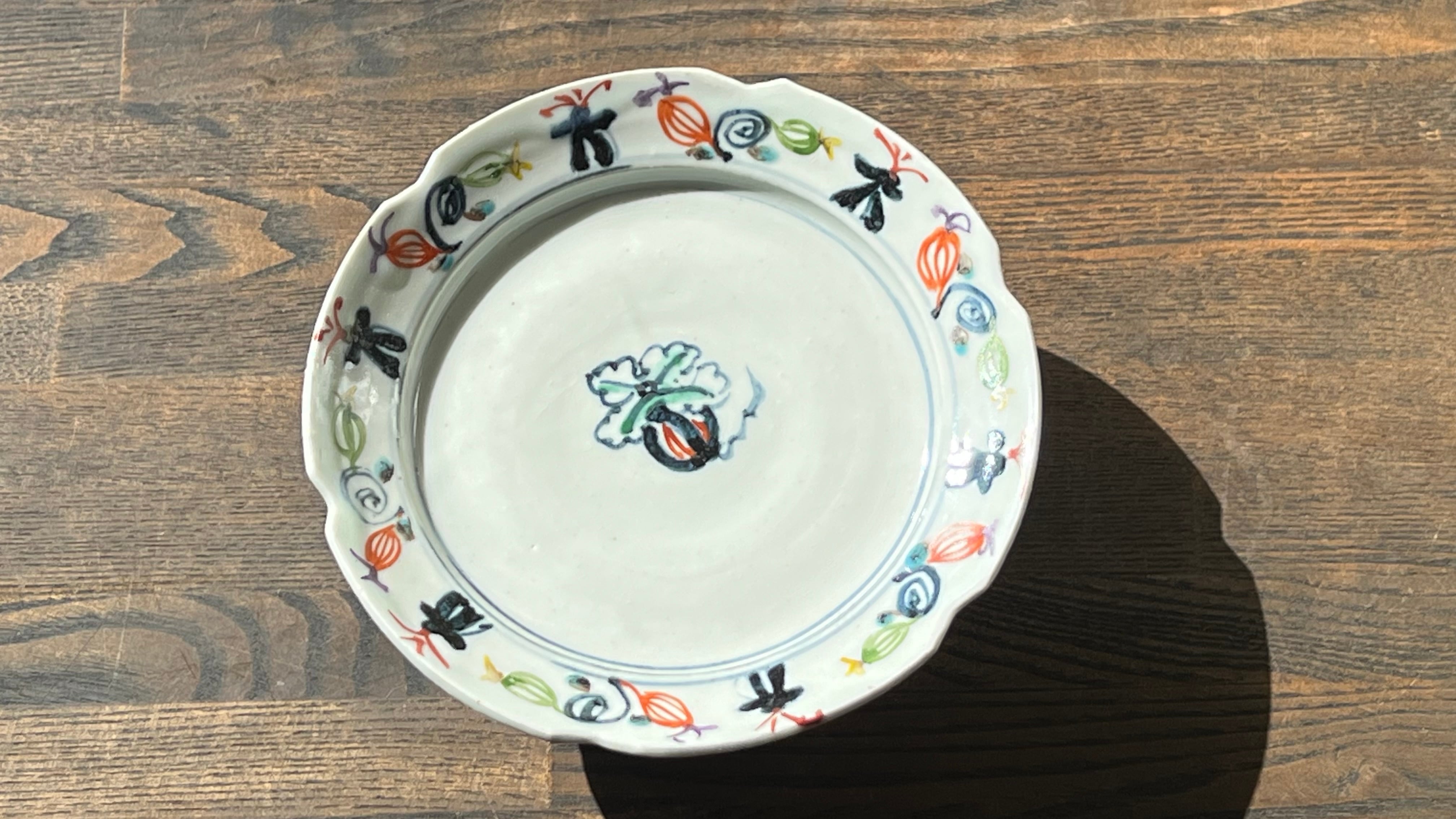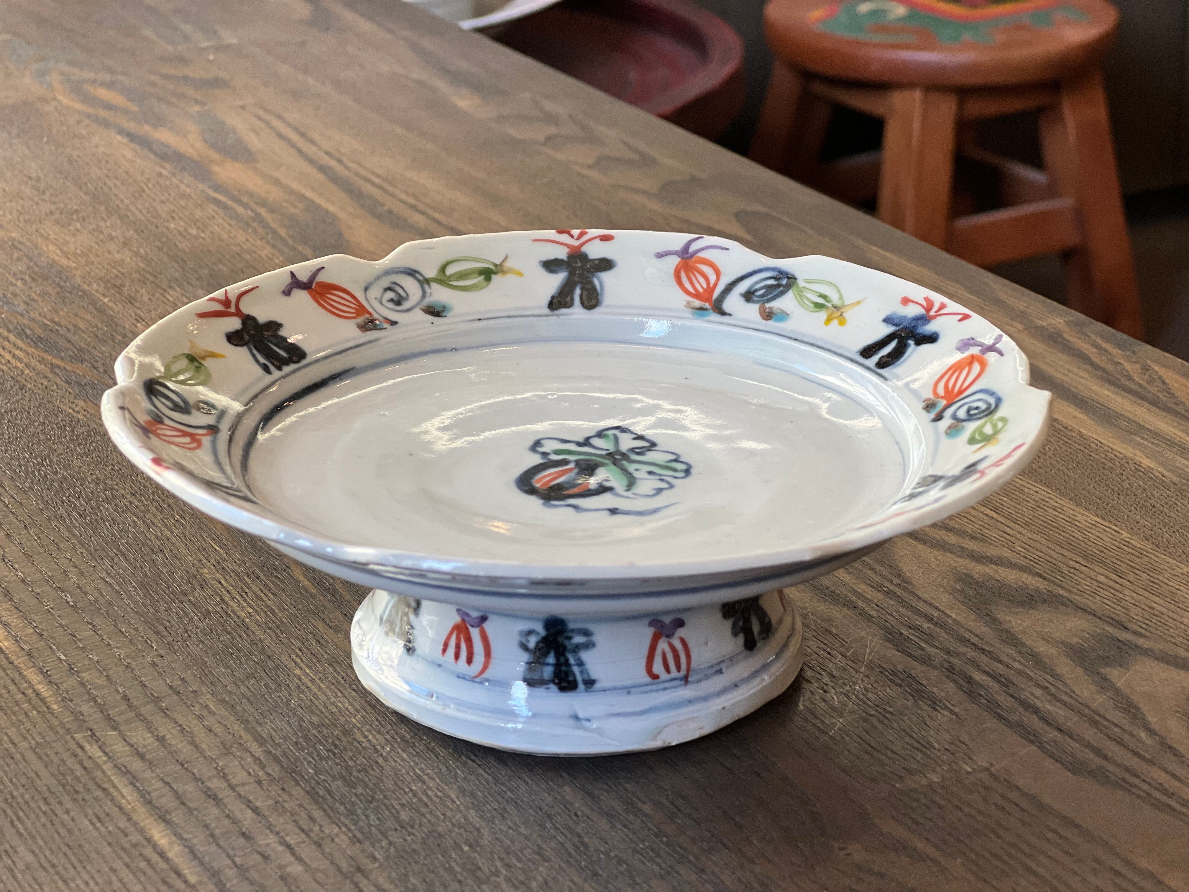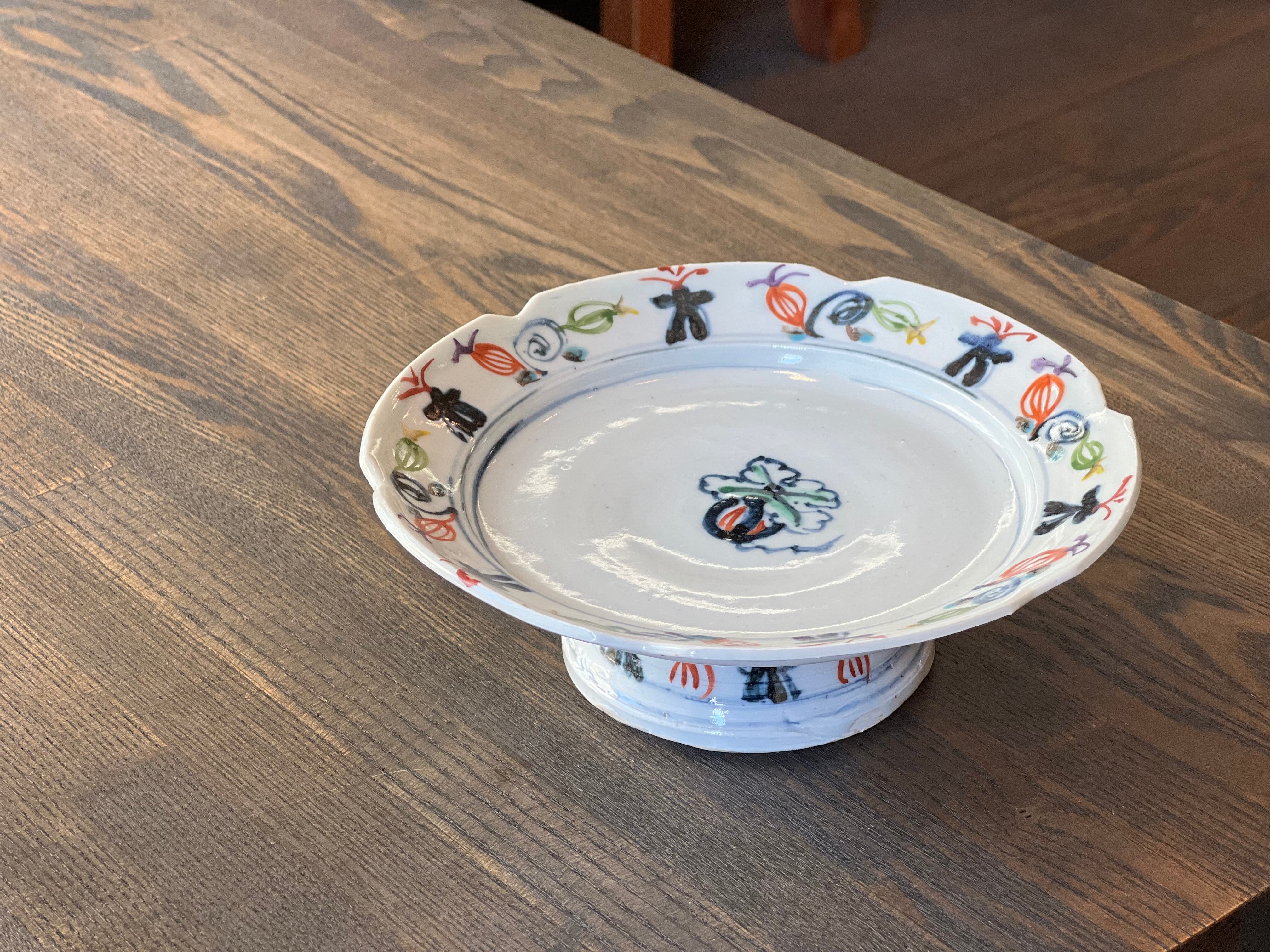 見込み中央に瓜文、周りの縁には色とりどりの瓜、蔓、兜の絵がいっぱい。高台の周りにもいっぱい描かれていて、とにかく楽しい高台向鉢です。3点唐津から来ましたが、手作りのため若干大きさに違いがあります。ご了承ください。※一点のお値段です。