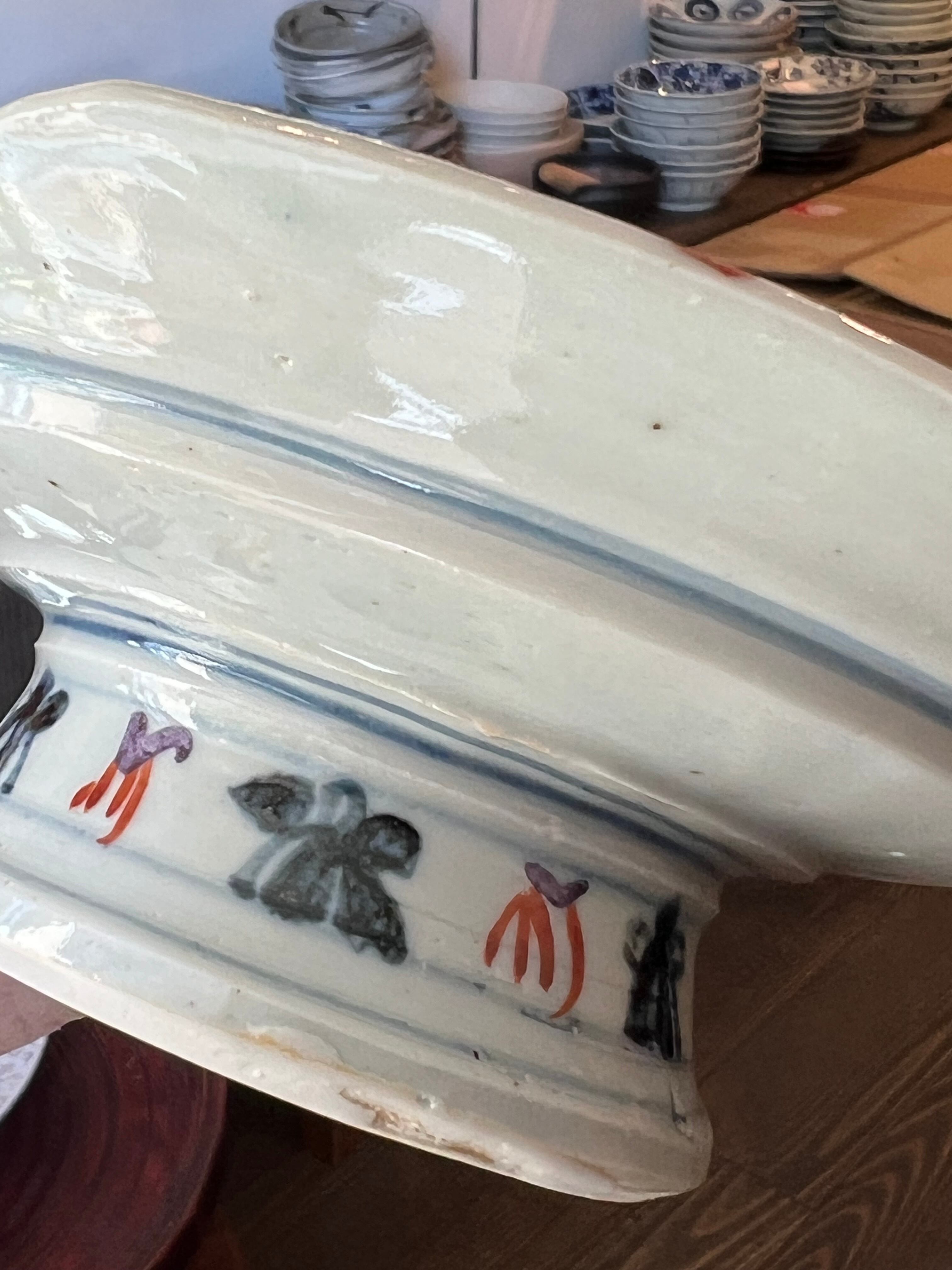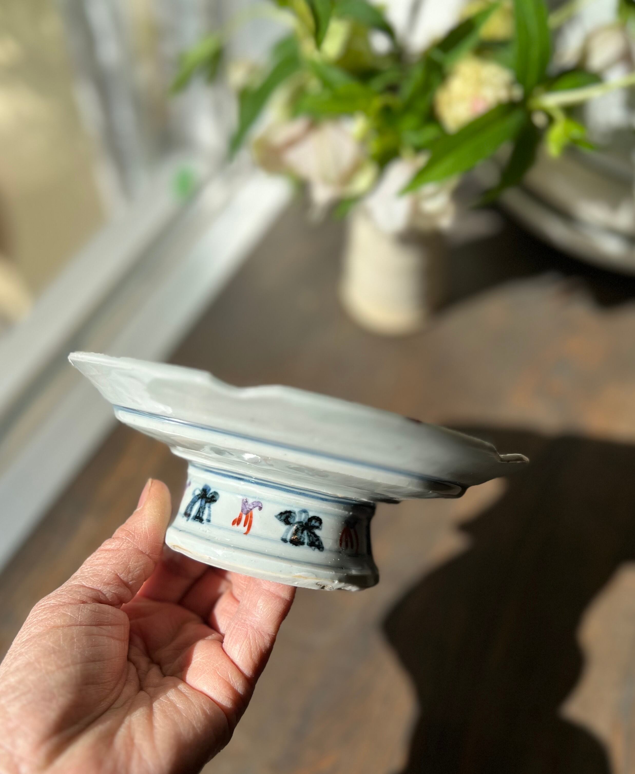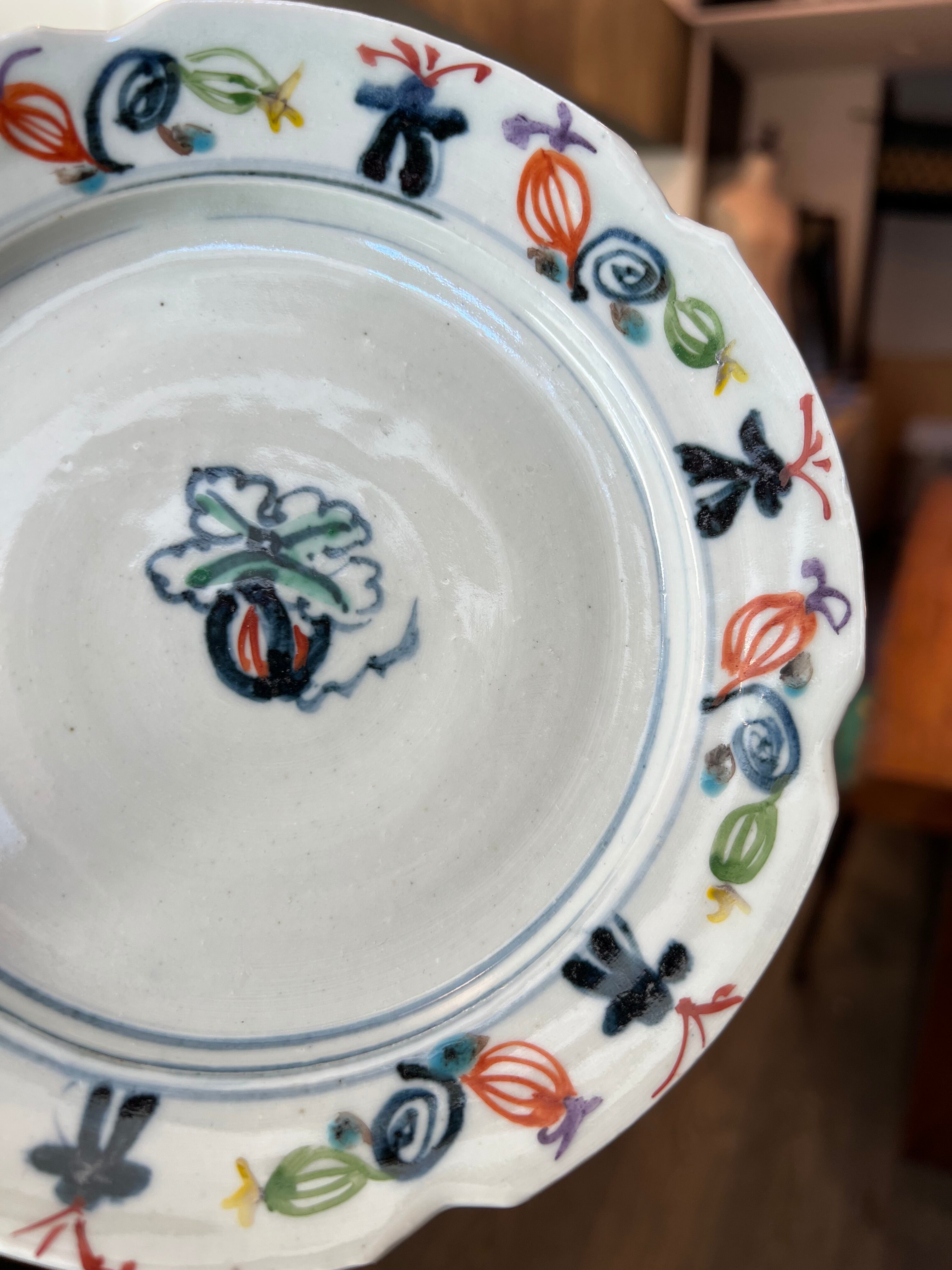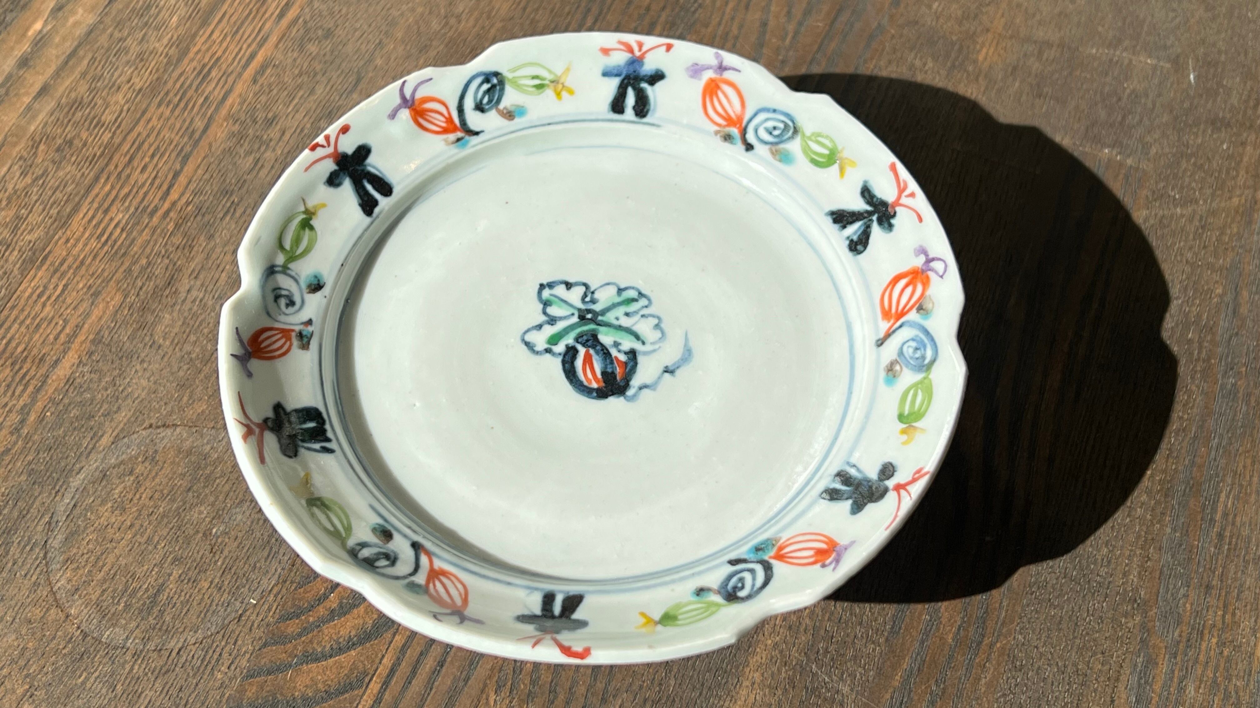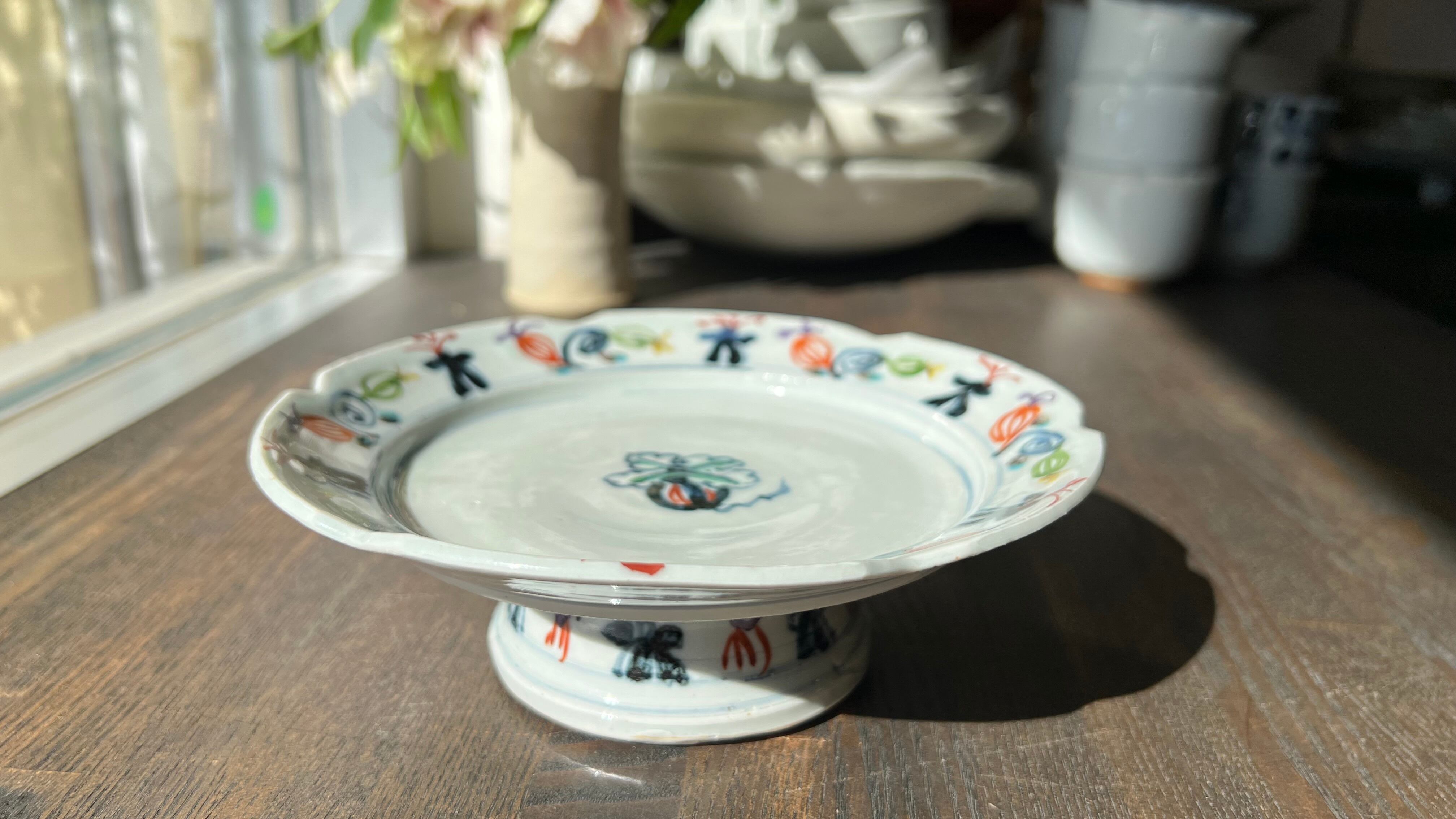 見込み中央に瓜文、周りの縁には色とりどりの瓜、蔓、兜の絵がいっぱい。高台の周りにもいっぱい描かれていて、とにかく楽しい高台向鉢です。3点唐津から来ましたが、手作りのため若干大きさに違いがあります。ご了承ください。※一点のお値段です。