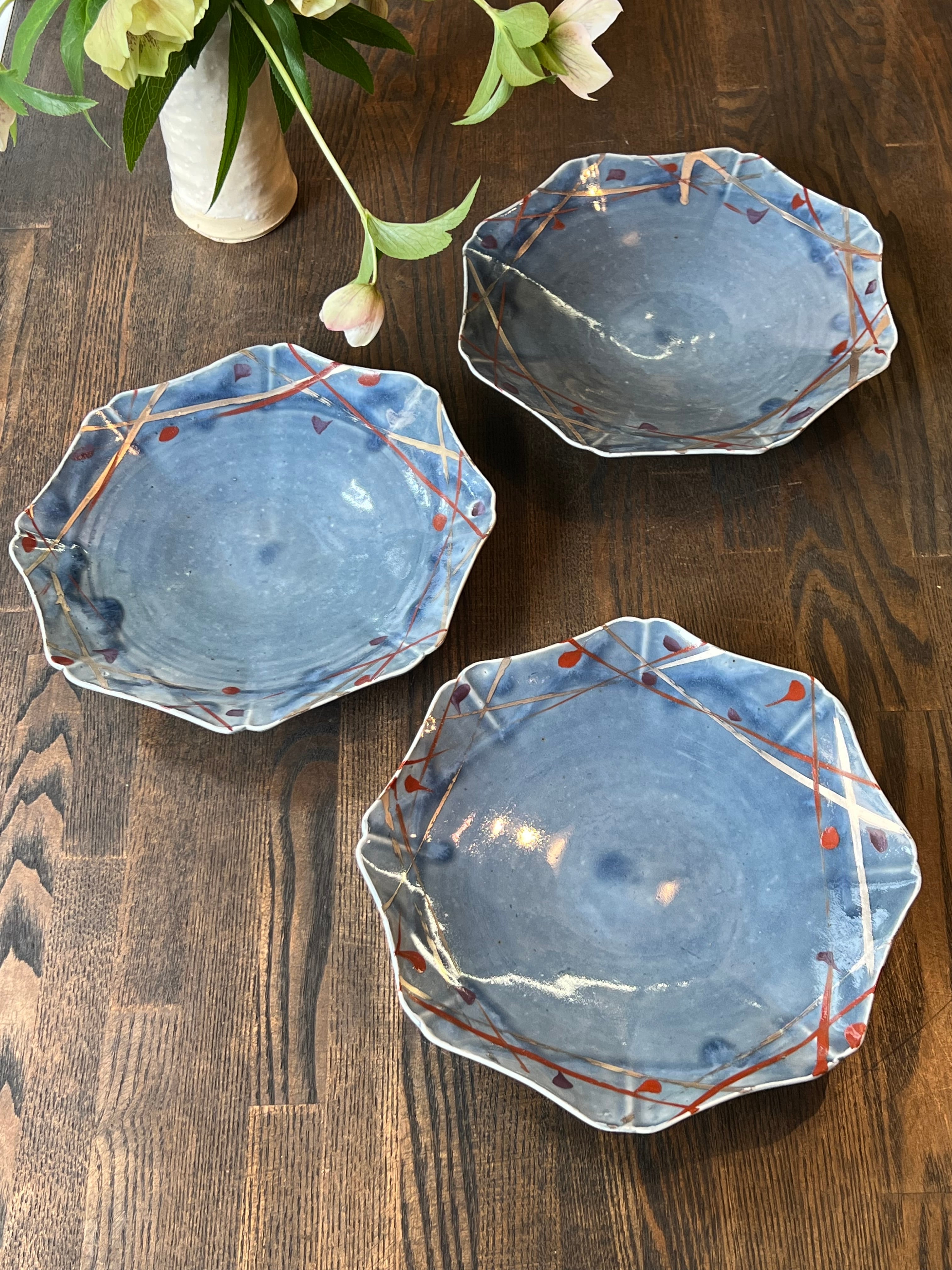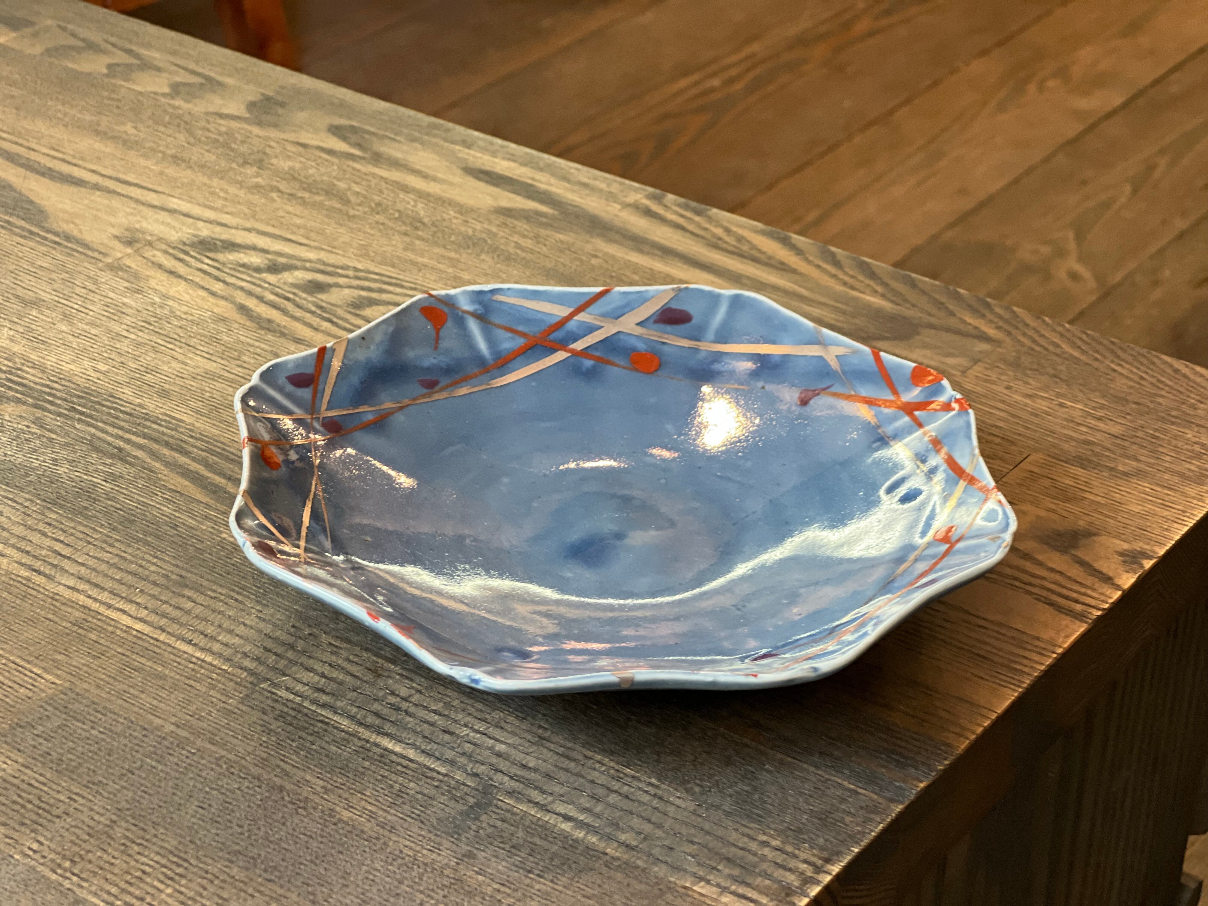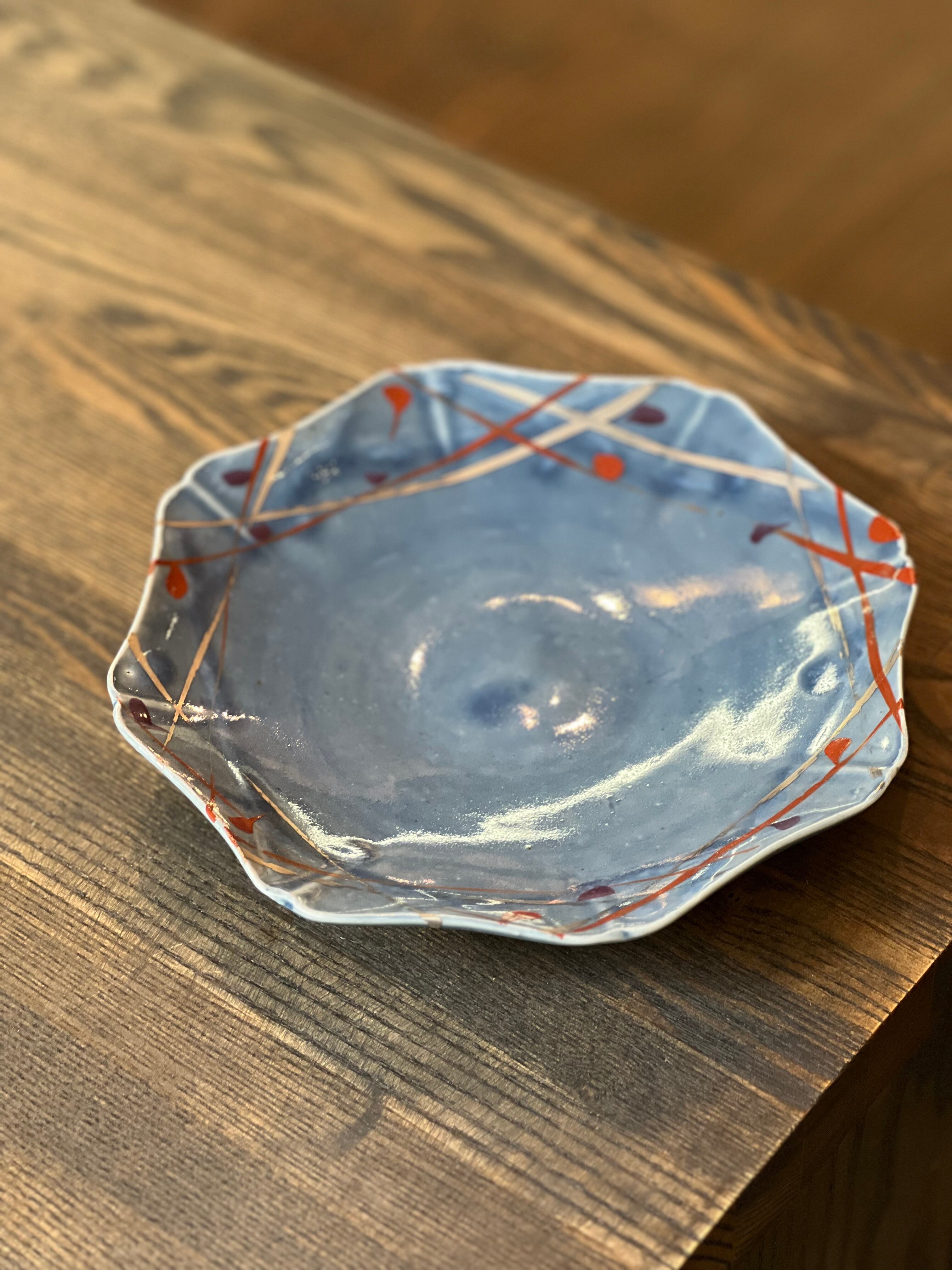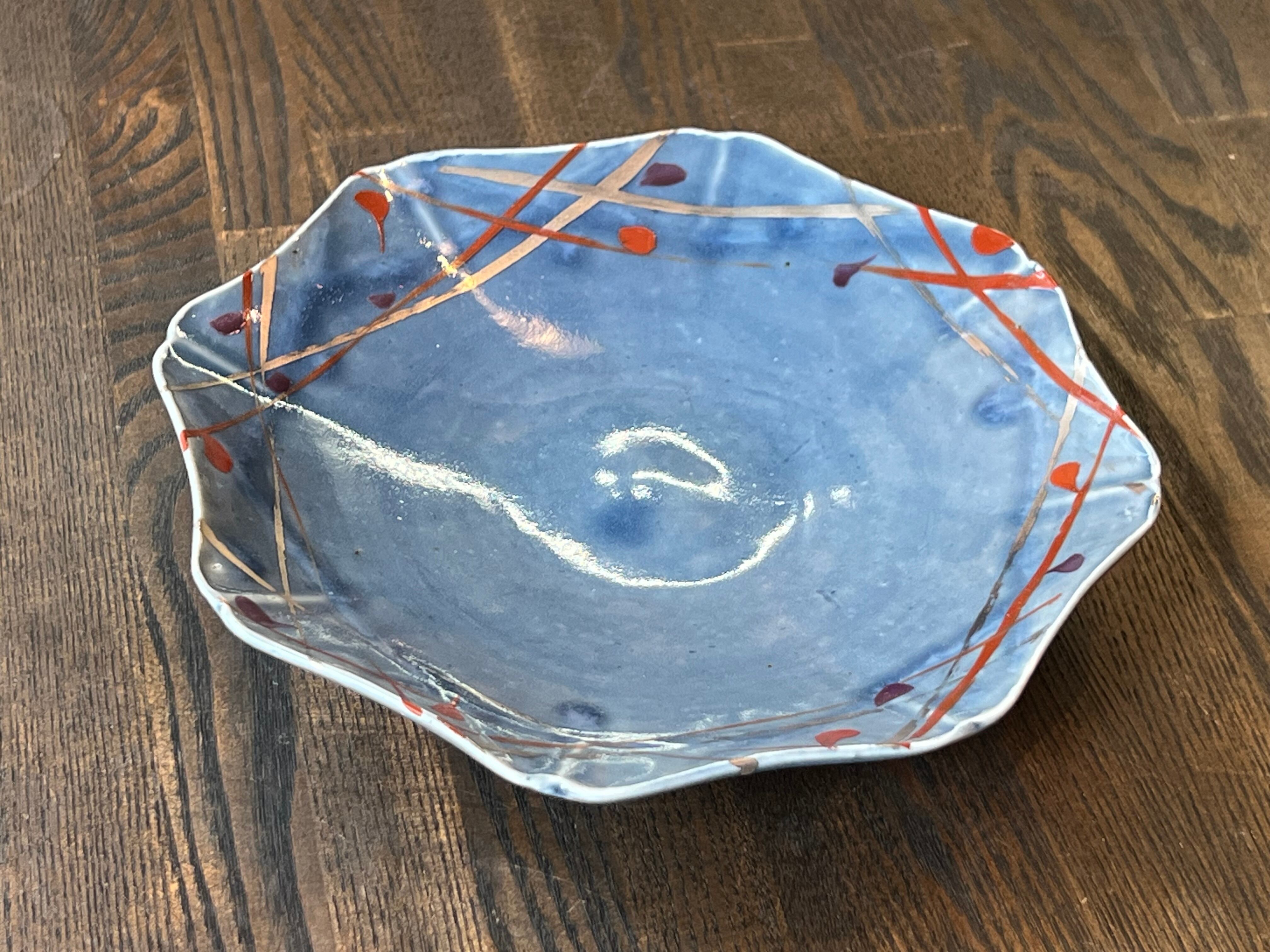 O-26-13、薄瑠璃赤絵白金彩八稜向皿