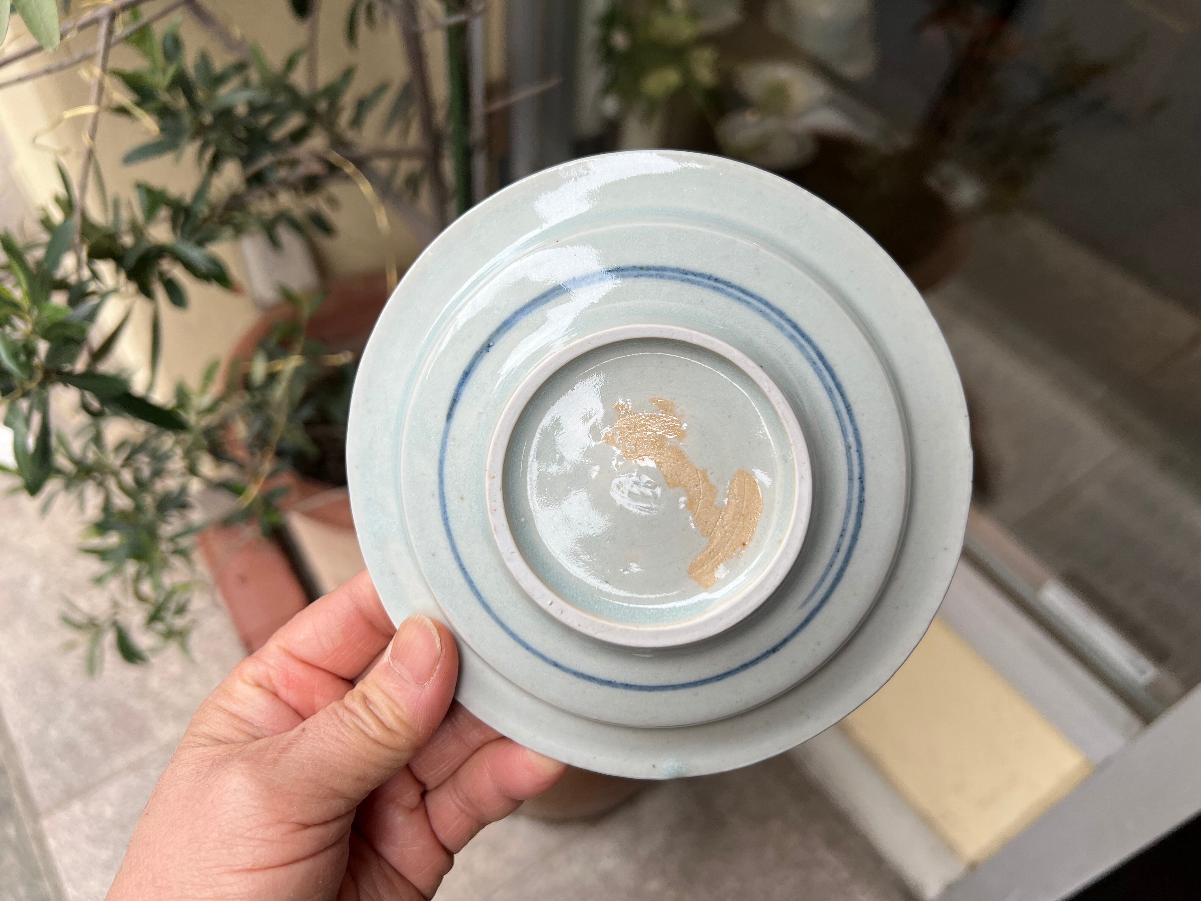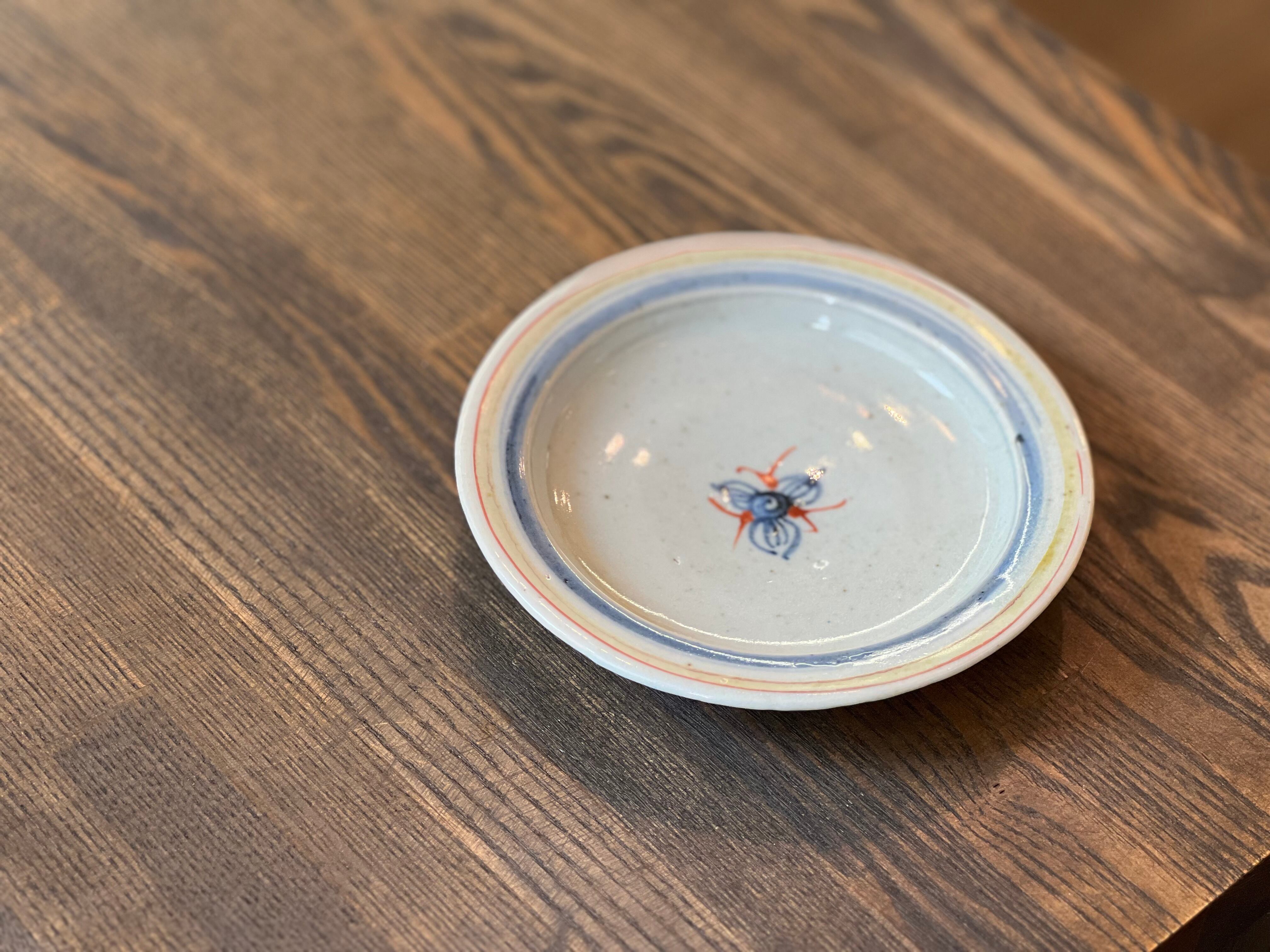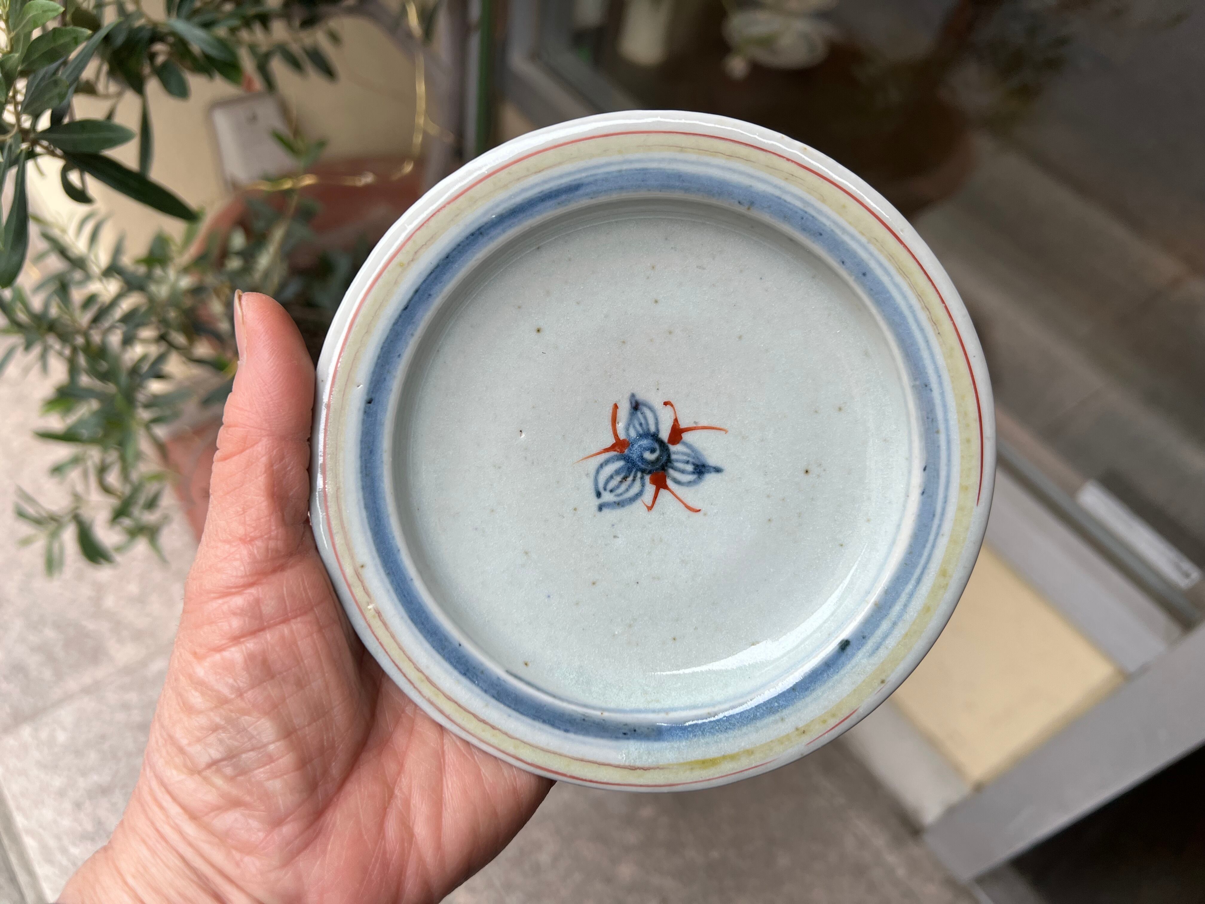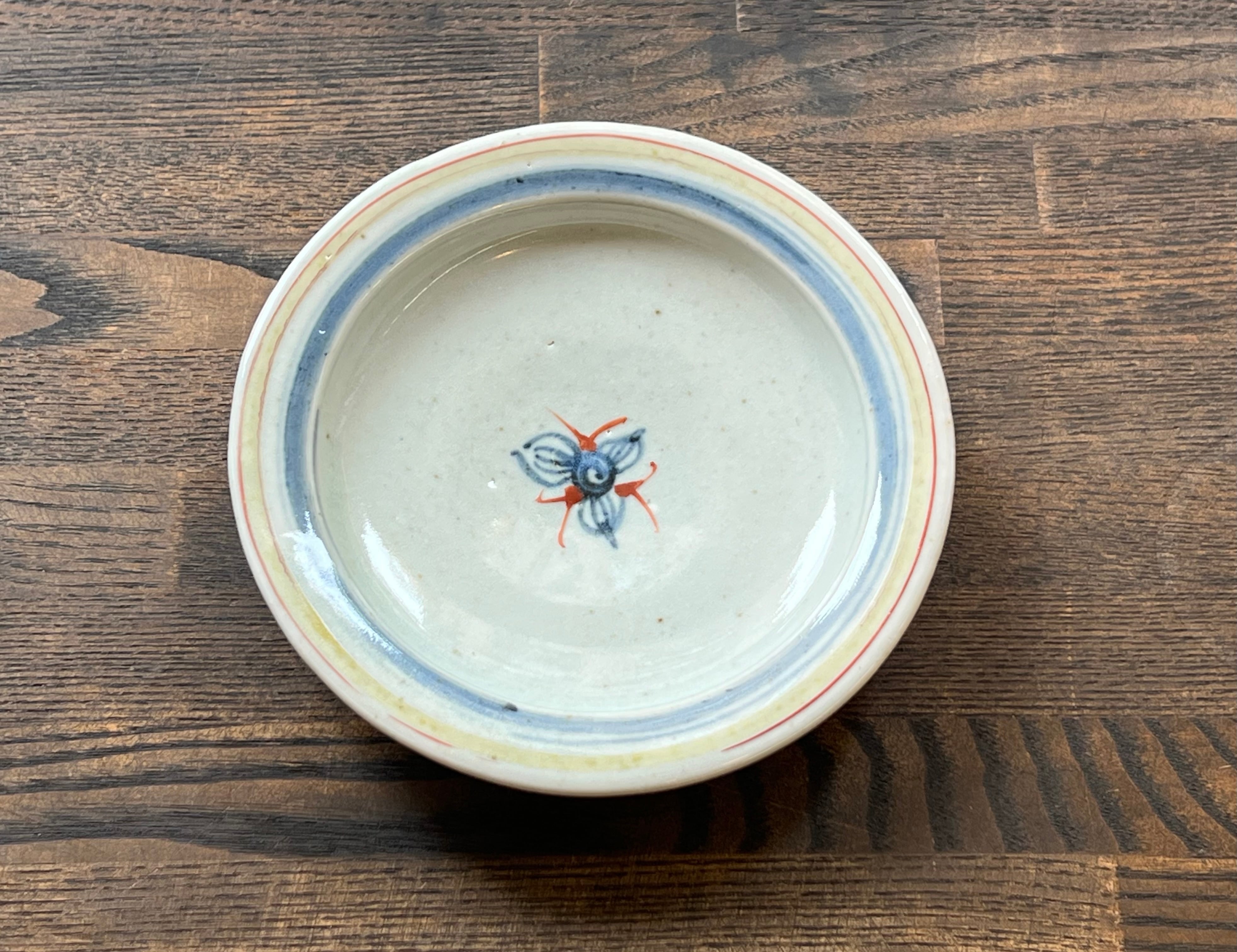 見込み中央は花の絵、口辺に呉須、黄、赤の線がシンプルに。独楽模様というそうです。