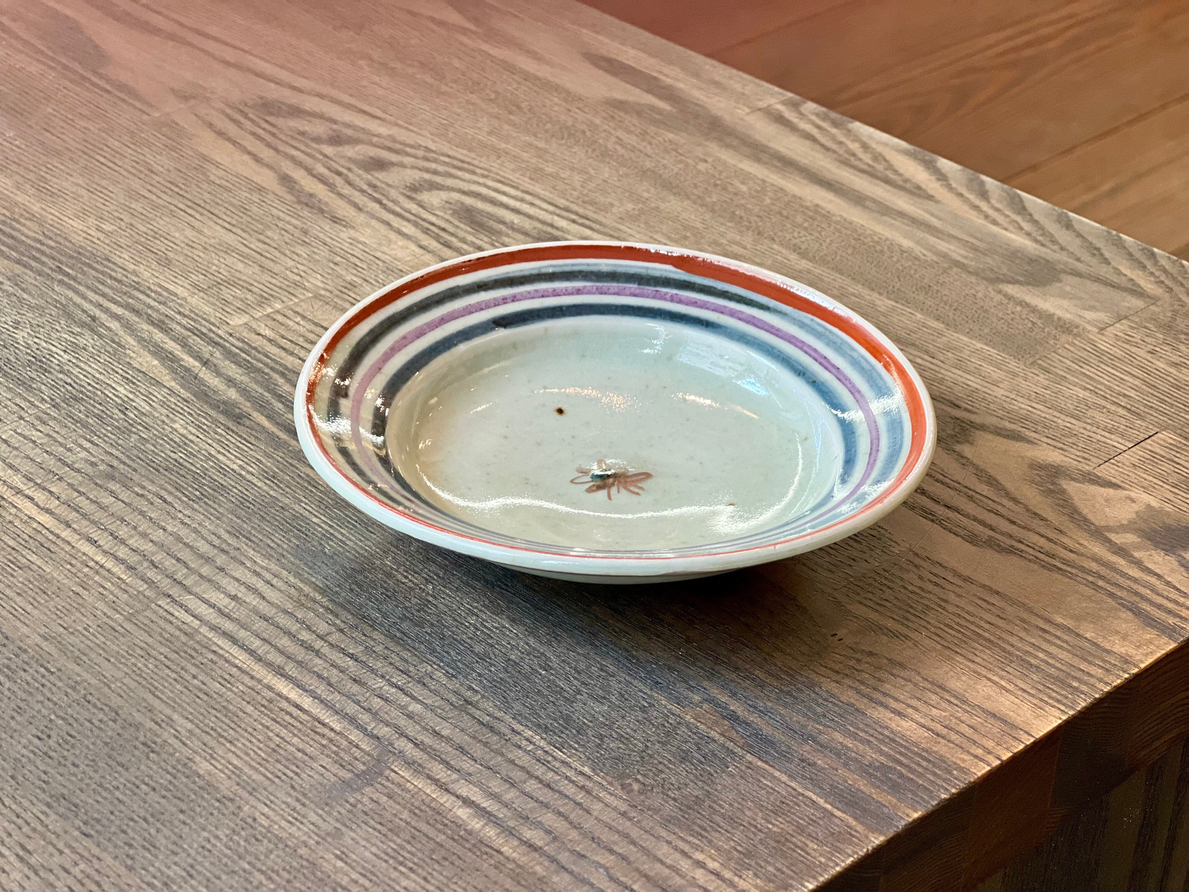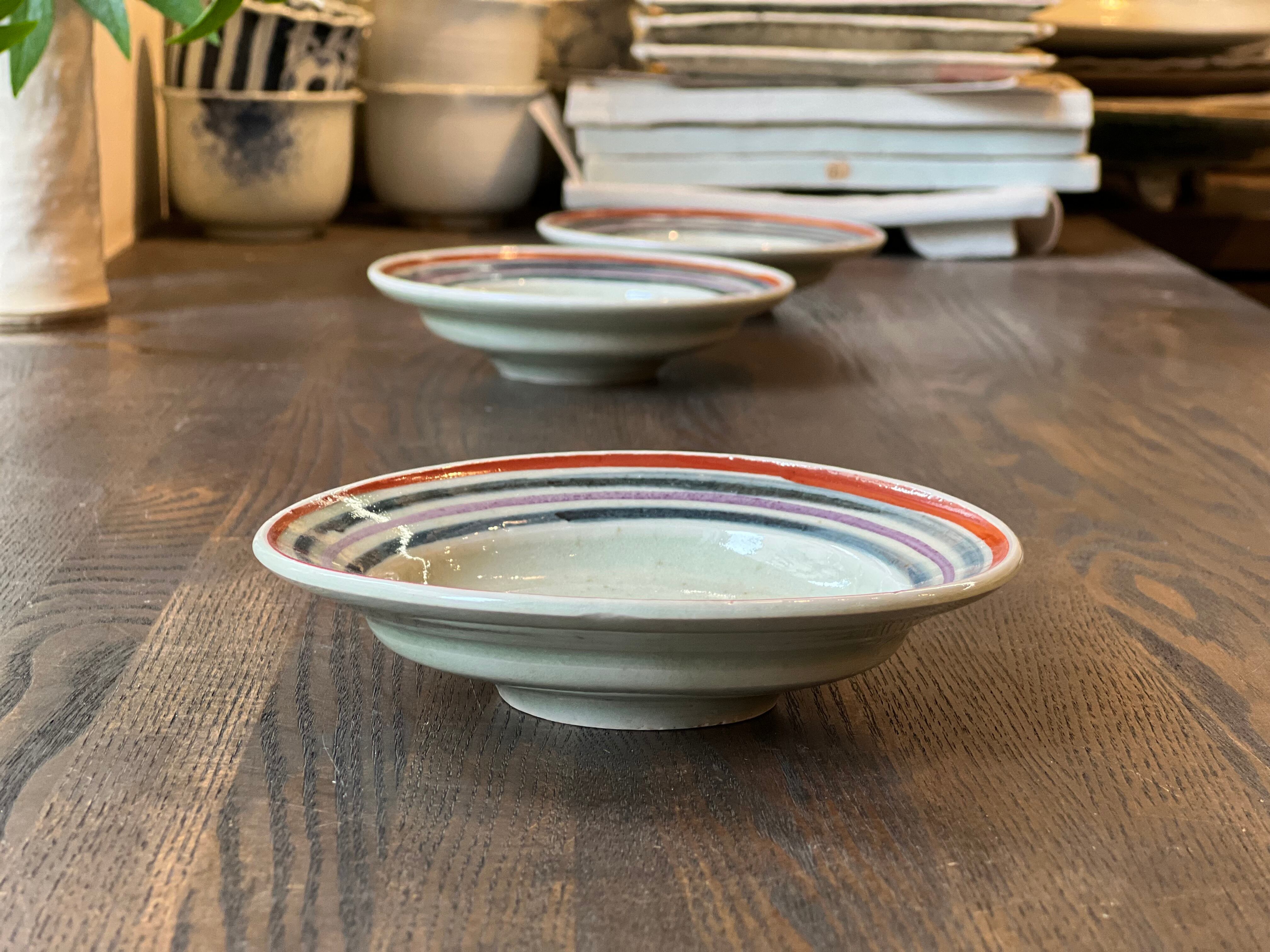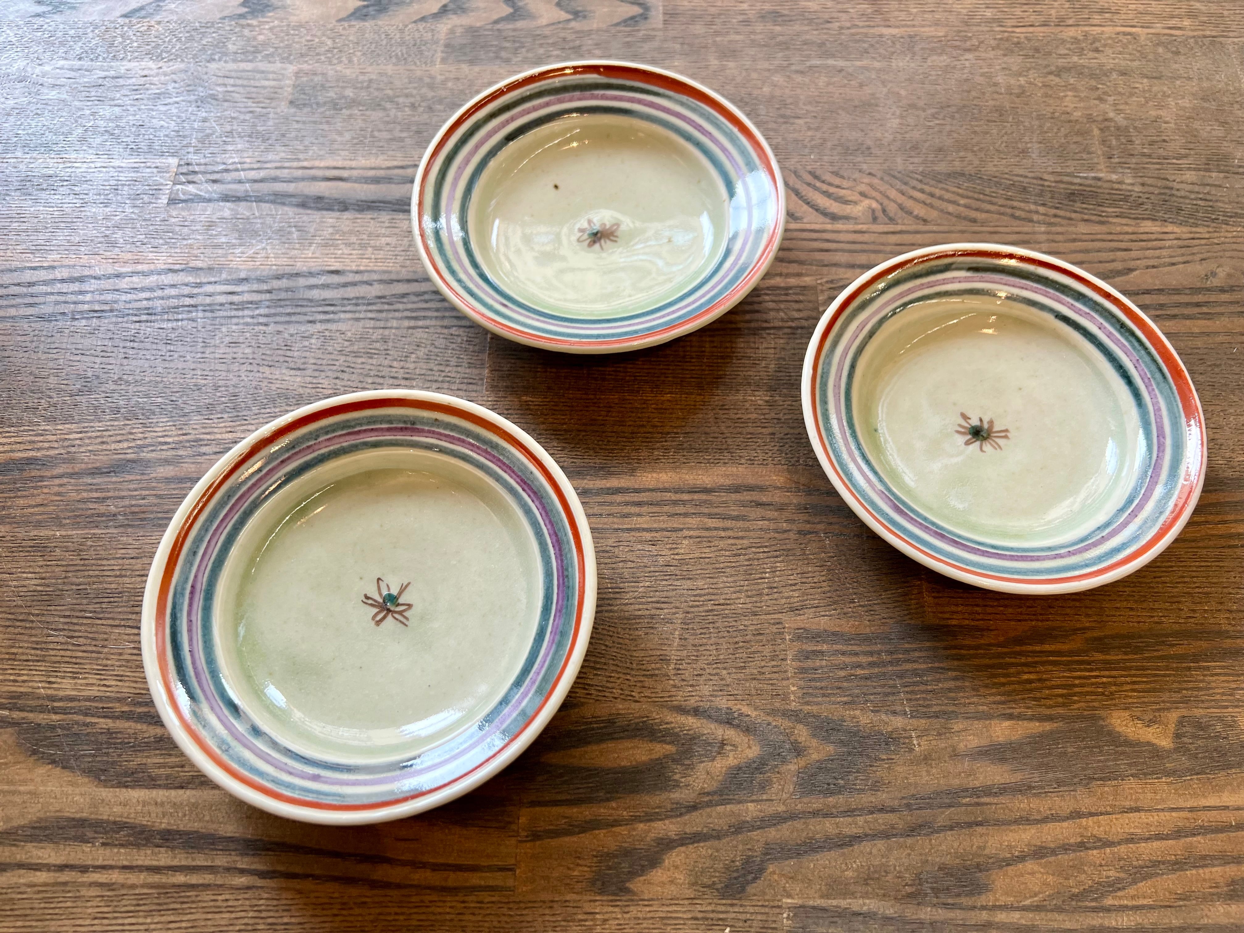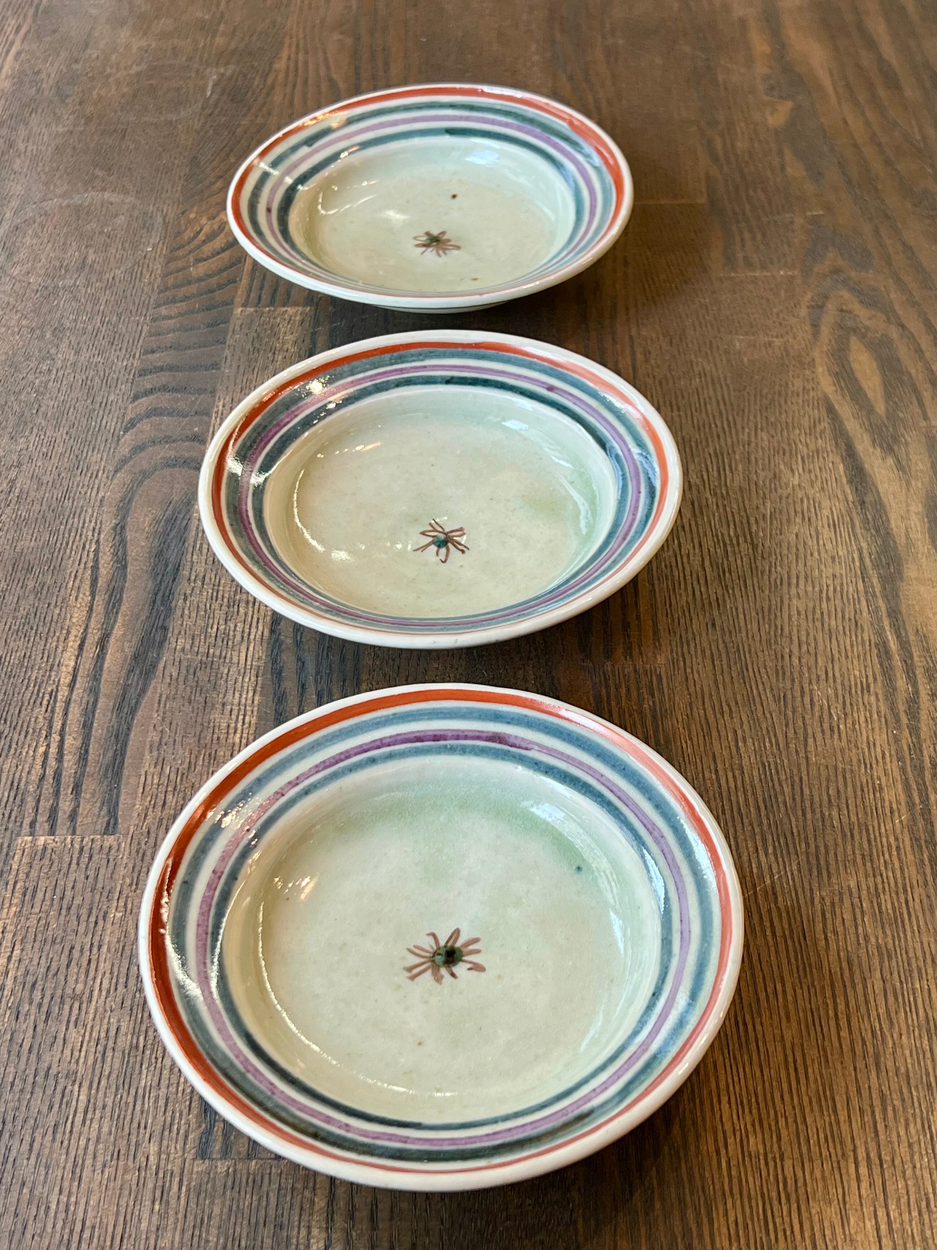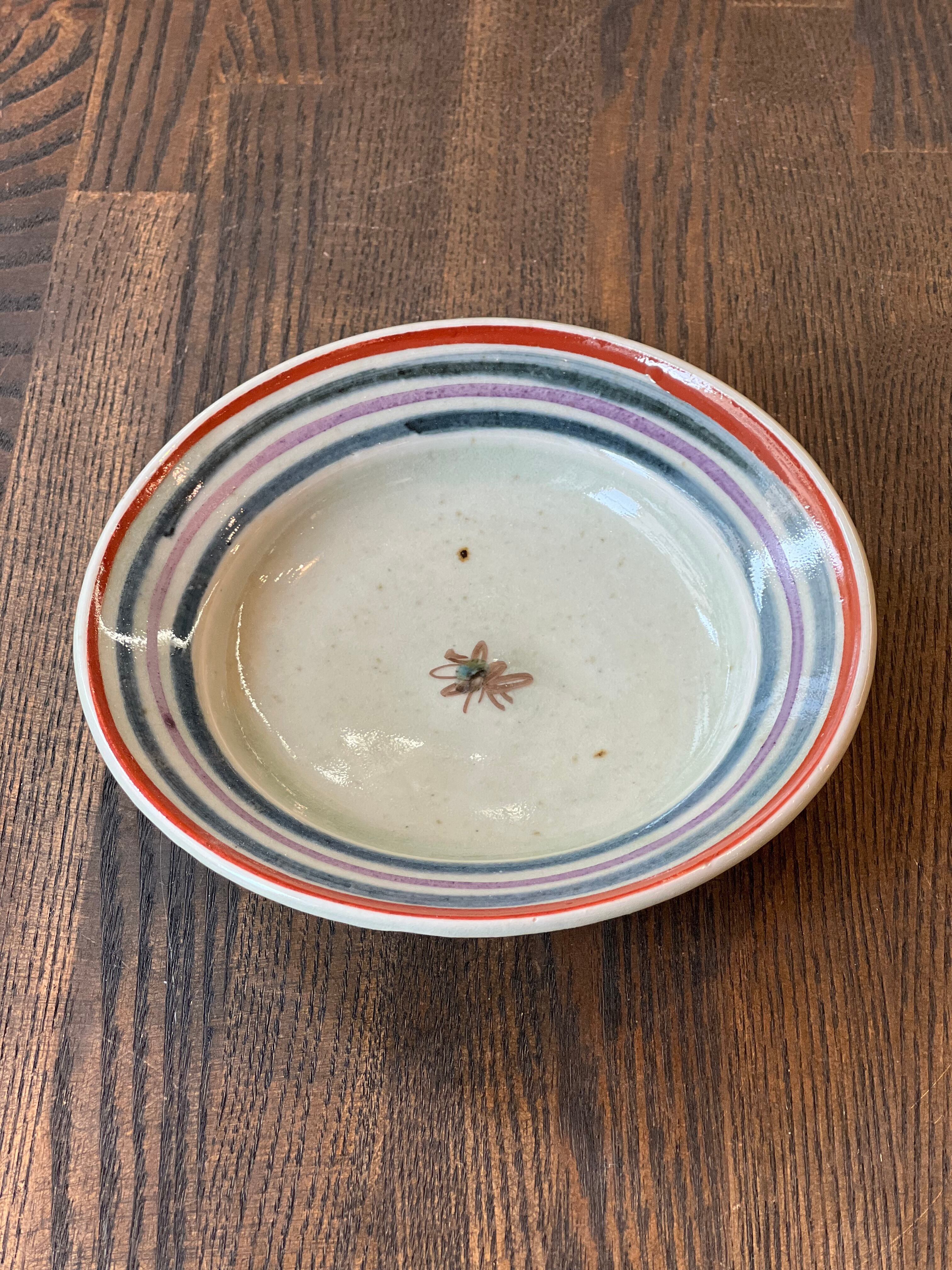 呉須に紫と赤の色絵を乗せた独楽文の四寸皿です。※一枚の価格です。