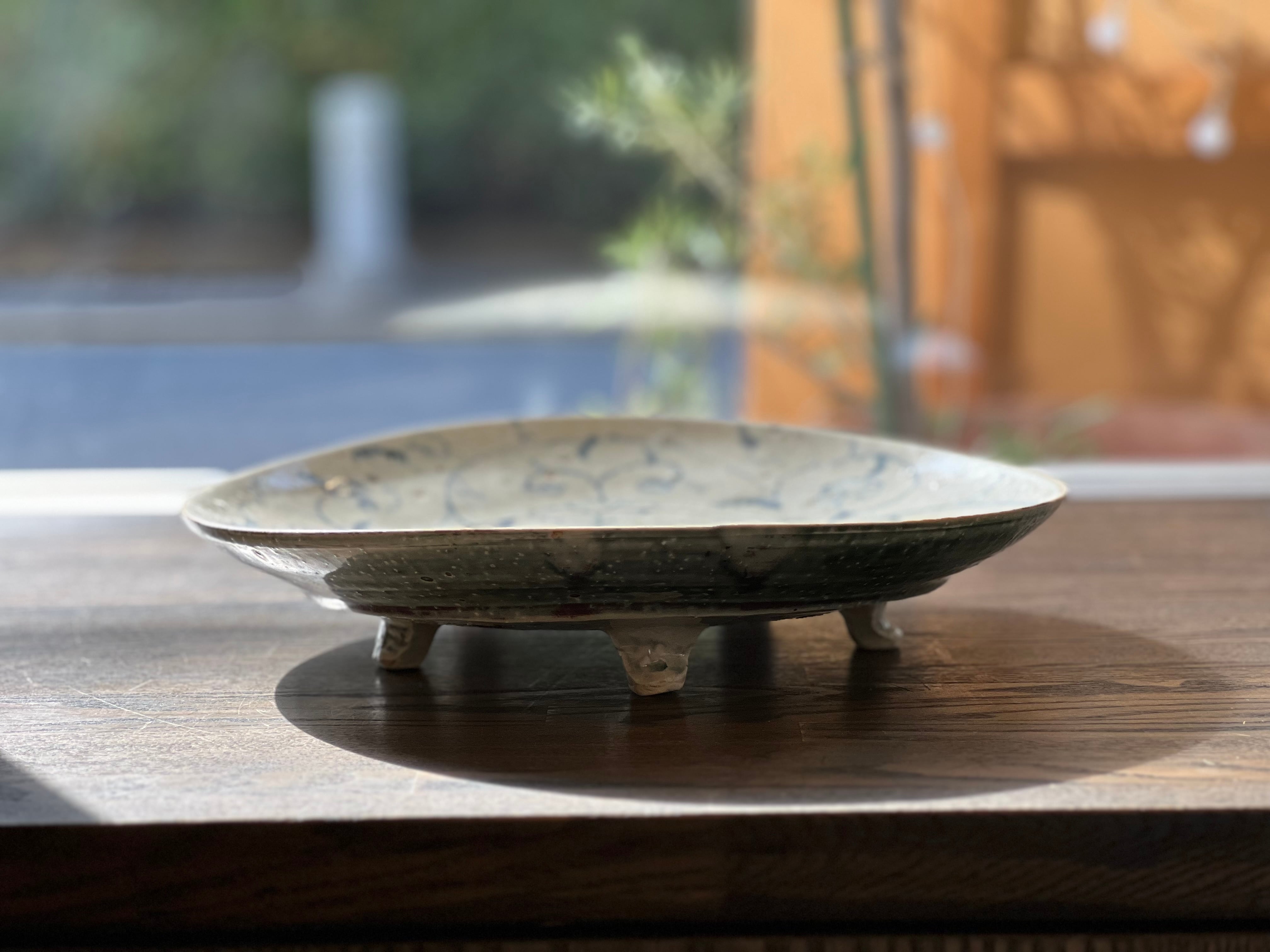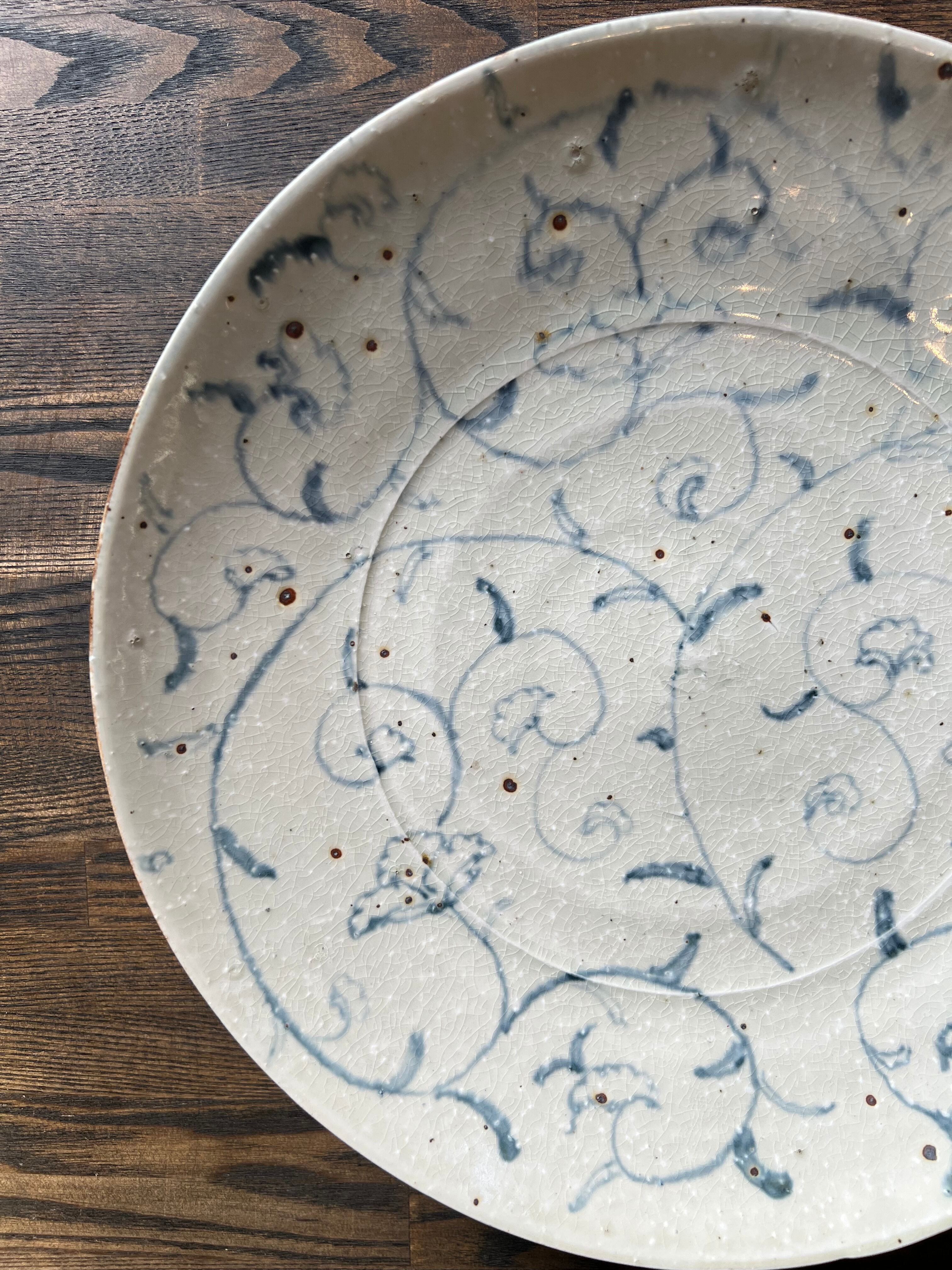 内側には、呉須で花唐草の紋様が伸び伸びと柔らかく描かれています。深さもあるので汁も入り存在感あり、色々な場面で目を引く逸品です。裏の緑釉もとてもステキです。
